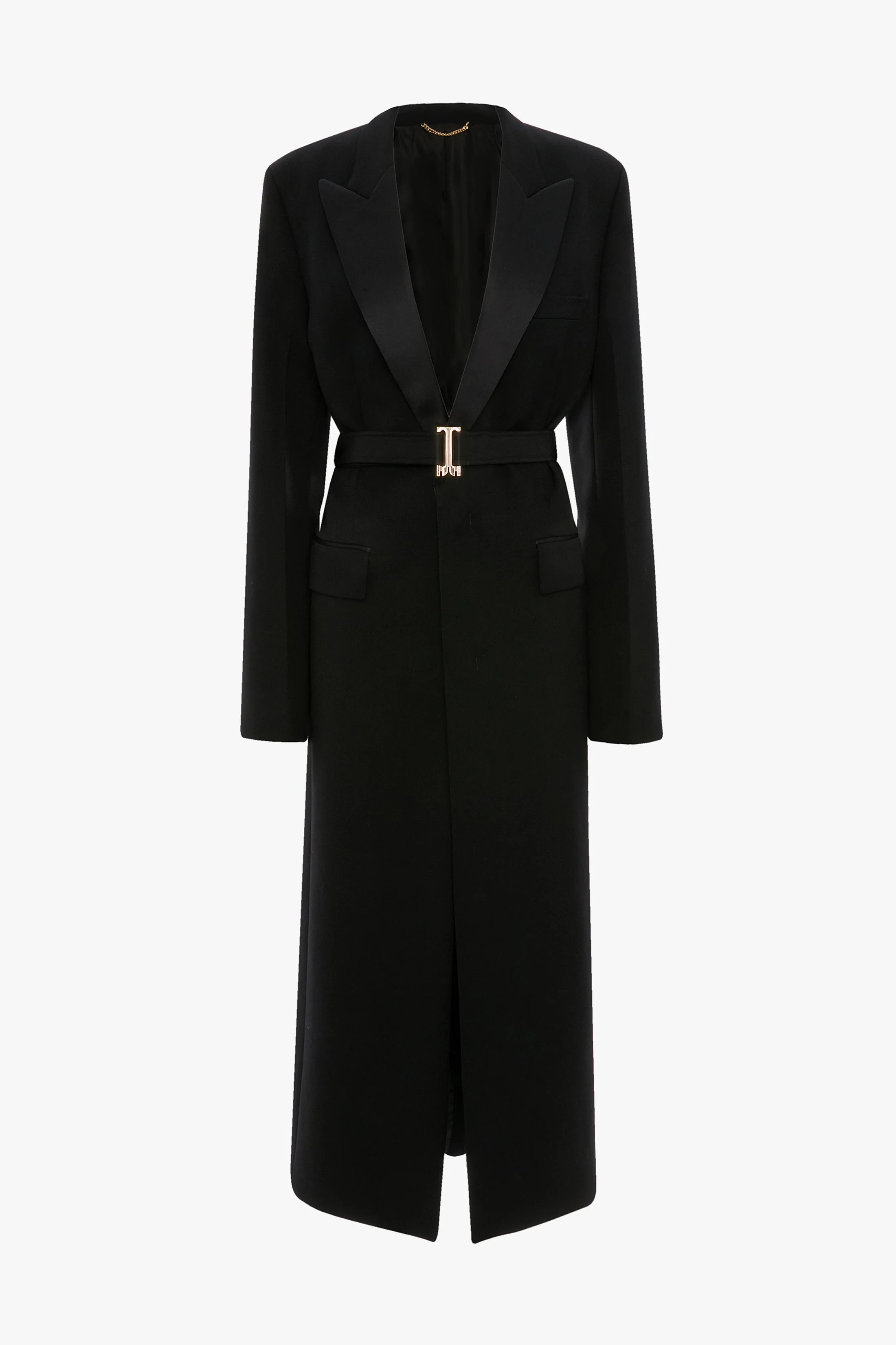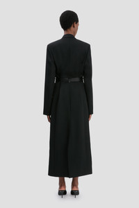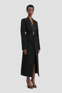 The grain de poudre fabrication and longline silhouette bring a sumptuousness to the Belted Tailored Coat. Elevated with contrasting satin lapels, waist belt and belt loops, it is a practical and polished piece of outerwear. A centre back vent and concealed front button closures complete the look. Size & Fit - Fits true to size, take your normal size - The model is 5'10’’/178cm and is wearing a size Product Details - Grain de poudre coat - B-trim belt - Longline - Contrast satin lapels, belt and belt loops - Two hidden front button closures - Front and chest welt pockets - Centre back vent - 55% Polyester 45% Virgin Wool - Made in Portugal