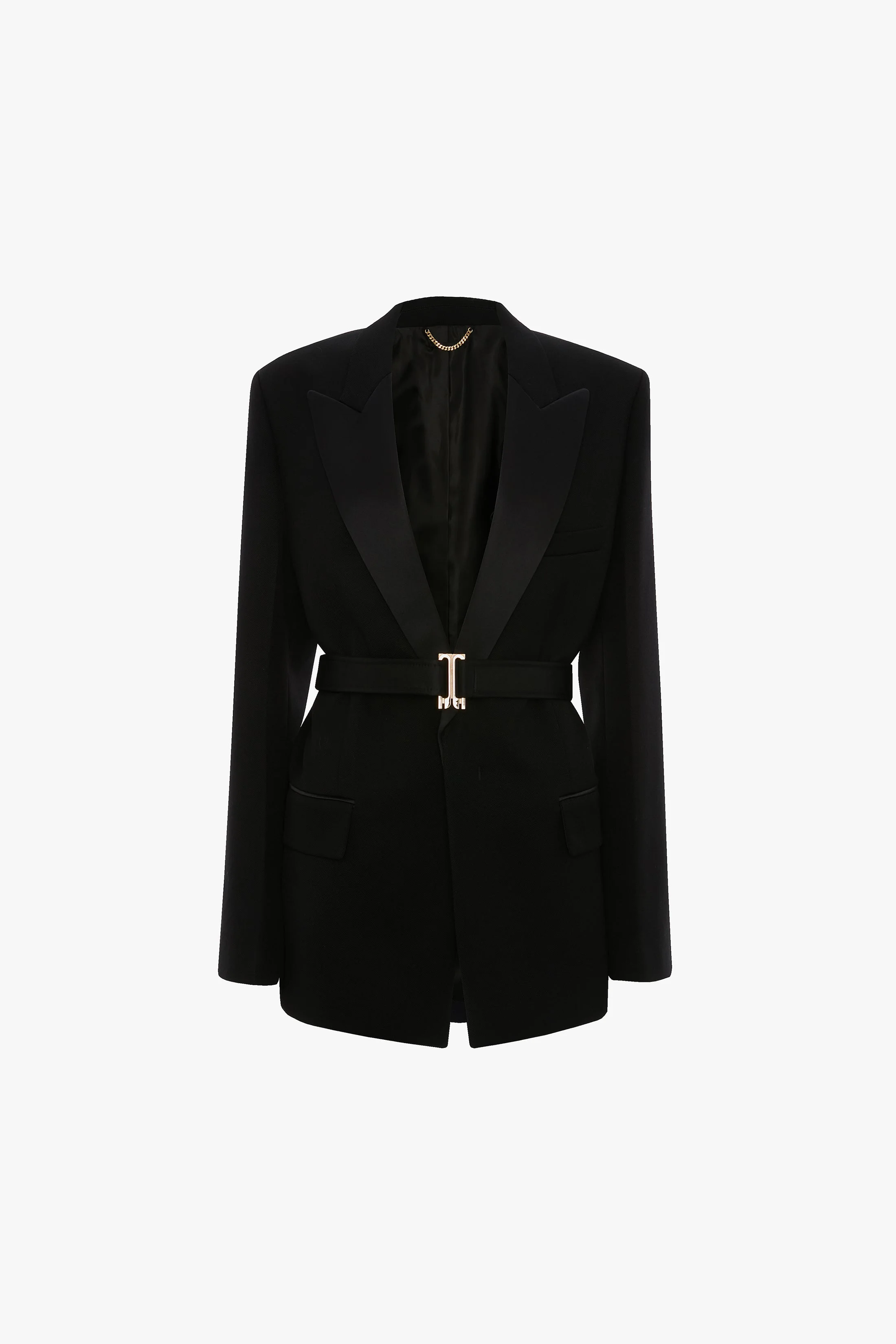 The traditional tuxedo jacket is reimagined with a B trim belt for a distinctly feminine silhouette. Immaculately tailored from grain de poudre and cut to finish below the hip, the Belted Jacket in Black has contrasting satin lapels and buttons and is finished with welt pockets and double back vents. Size & Fit - Fits true to size, take your normal size - The model is 5'10’’/178cm and is wearing a size 6 Product Details - Grain de poudre jacket - Contrast satin lapels and B-trim belt - Concealed front button fastening - Sleeve vent - Satin covered buttons - Welt pockets - 55% Polyester 45% Virgin Wool - Made in Portugal
