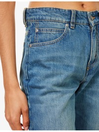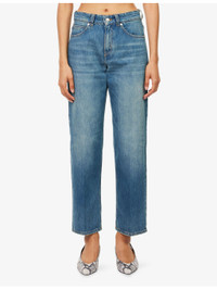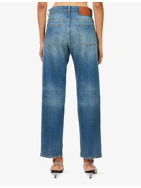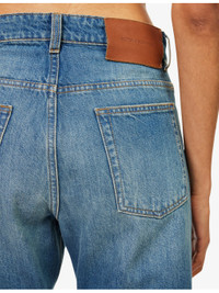 PRODUCT DETAILS - Victoria Beckham denim jeans - 100% cotton; pocketlining 65% polyester, 35% cotton; trims 100% leather - Exposed button and concealed zip-fly fastening at front - Relaxed fit, high-rise, straight leg, belt loops, five pockets, brand patch at back, faded wash and whiskering - Machine wash at 30°C - Made in Italy - True to size - Size 26: rise 12in / 30cm, inside leg 29in / 74cm, leg opening 16in / 41cm - Model is 5ft 10in/1.78m and wears a size 26 - Lightweight, slight stretch Ref: R04538500