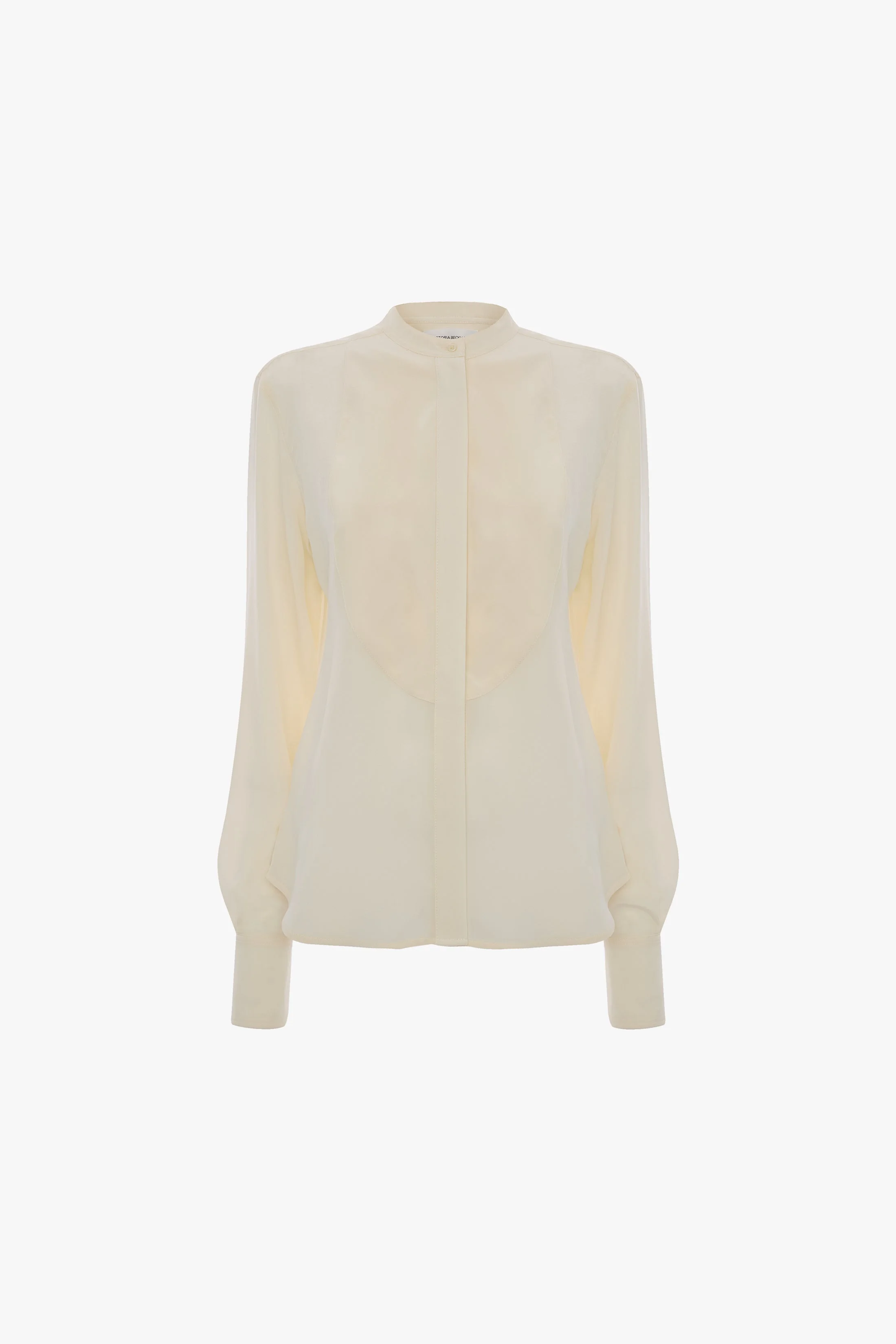 - Cotton poplin shirt - Oversized fit - Front bib panel - Back yoke detail - Back button placket - Cuff placket with singular button - Contrast VB logo embroidery - 100% Silk - Made in Portugal A fresh take on tuxedo style, the Bib Detail Shirt in Ivory is crafted from cotton poplin and designed with an oversized fit. Traditional design details include a front bib panel, back yoke detail and back button placket. A contrasting embroidered Victoria Beckham monogram completes the look. SIZE & FIT - The model is 5'9’’/177cm and is wearing a size 8 - Fits true to size, take your normal size