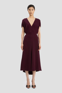 Midi dresses are a house signature and the Blouson Detail Midi Dress is characterised by short, full sleeves with tactile rope edging and a contrasting topstitch. A front V neckline with internal binding adds a discrete design detail, while a longer-length hemline at the back adds fluidity to the silhouette. Shaped at the waist for a flattering fit, the Blouson Detail Midi Dress is presented in rich Merlot for the new season and is an effortless, wear-anywhere item. Size & Fit - Fitted at the waist - Fits true to size, take your regular size - The model height is 5'11’’/180.5cm and is wearing a size 6 Product Details - Fluid cady blouson sleeve midi dress - Front v-neckline with tonal topstitching - Gathered sleeve hem with internal cord detail - Hem graduates to be slightly longer at the back - Contrast topstitch detail to sleeve hem - 50% Viscose 47% Acetate 3% Elastane - Dry clean only - Made in Portugal