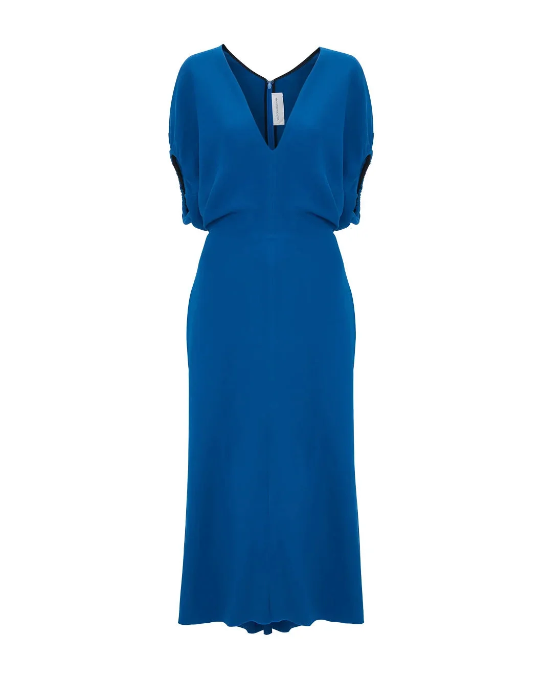 FINAL SALE The Blouson Detail Midi Dress in Sapphire by Victoria Beckham is a midi dress featuring short full sleeves, v-neckline, and seam details. - Concealed zip with hook and eye closure at back - Made in Portugal - 50% Viscose 47% Acetate 3% Elastane - #1225WDR006831A