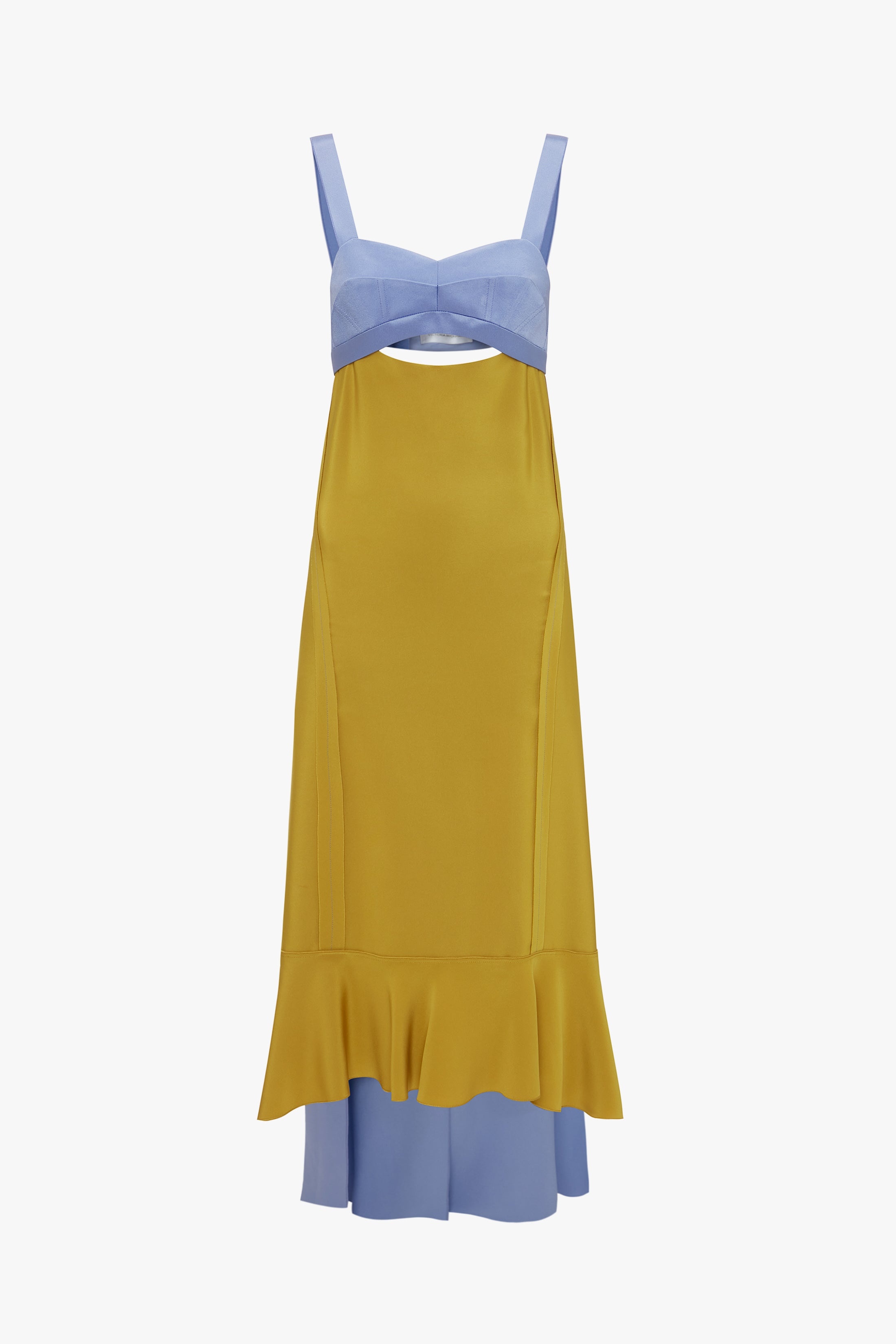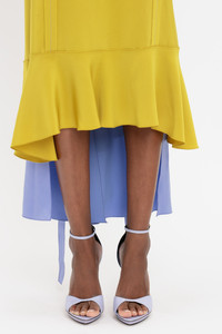 Provocative but polished, the Bra Detail Maxi Dress has a structured bra bodice detail with straps that extend to the back. A playful cutout beneath the bust and a V-shape design feature at the lower back add a flirtatious flourish. The double layer skirt in an energetic Lime and Lilac colourblock feels fresh and contemporary.Styled with the and the Chain Pouch with Strap Product Details - Fluid cady fabrication - Structure bra detail bodice - Opening at front underbust - Double layer skirt - V-shape at back waist - Fits true to size, take your regular size - The model height is 180cm and is wearing a 6 - Main: 71% Acetate 29% Viscose - Dry clean only - Made in United Kingdom