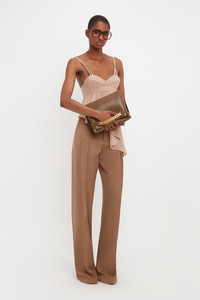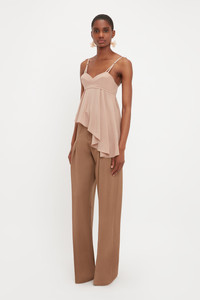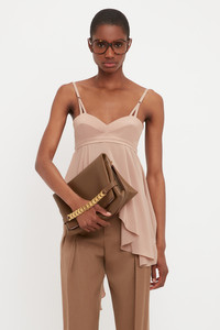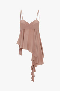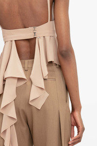 Structured bust cups and an almost-bare back create a provocative aesthetic softened by a fluid camisole with longer-length frill trims. Stitched detailing across the bra cups adds a subtle but sexy finishing touch. Styled with the and the Chain Pouch Product Details - Crepe de chine, soft finish fabrication - Hook and bar closure at the back - Draped asymmetric hemline - Fits true to size, take your regular size - The model's height is 180cm and is wearing a UK size 6 - 100% Silk - Dry clean only - Made in United Kingdom