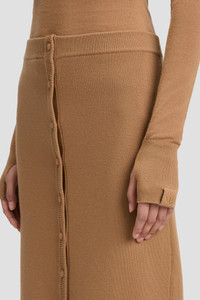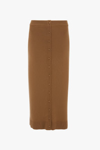 An unexpected front-button placket detail brings a modern twist to this sophisticated midi skirt. Presented in versatile Camel, the Button Detail Midi Skirt has a ribbed stretch waistband and complementary ribbed knit hemline. Knit covered buttons add a subtle but chic design detail. Styled with the High Neck Top & Sloan Mule Size & Fit - The model height is 5'11"/180cm and is wearing a size XS - Fits true to size Product Details - Midi length - Rib stretch waistband - Centre front button placket - Rib knit hem trim - Knit covered buttons - 82% Merino Wool 16% Nylon 2% Elastane - Dry clean only - Made in China