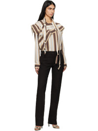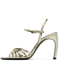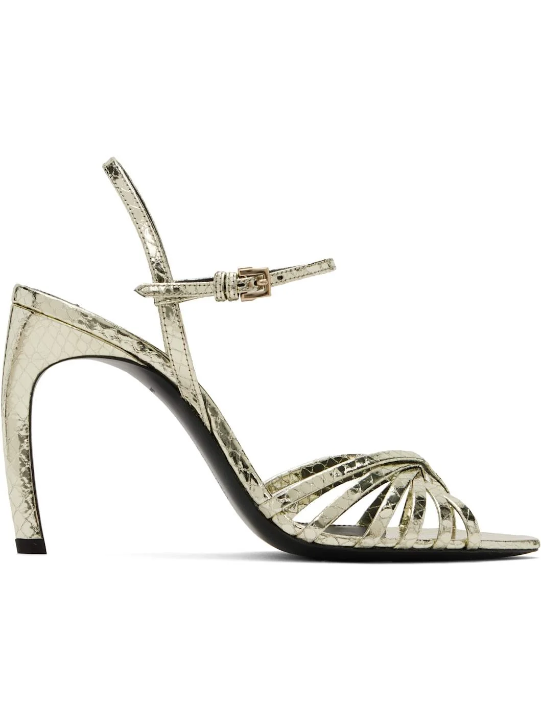 Snake-embossed patent kidskin heeled sandals in metallic gold tone. · Open pointed toe · Criss-crossing straps at vamp · Adjustable pin-buckle ankle strap · Logo patch at leather footbed · Covered stiletto heel with rubber injection · Polished leather sole · Heel: H3.75" Supplier color: Printed phyton Upper: kidskin. Sole: leather, rubber. Made in Italy 251784F125001