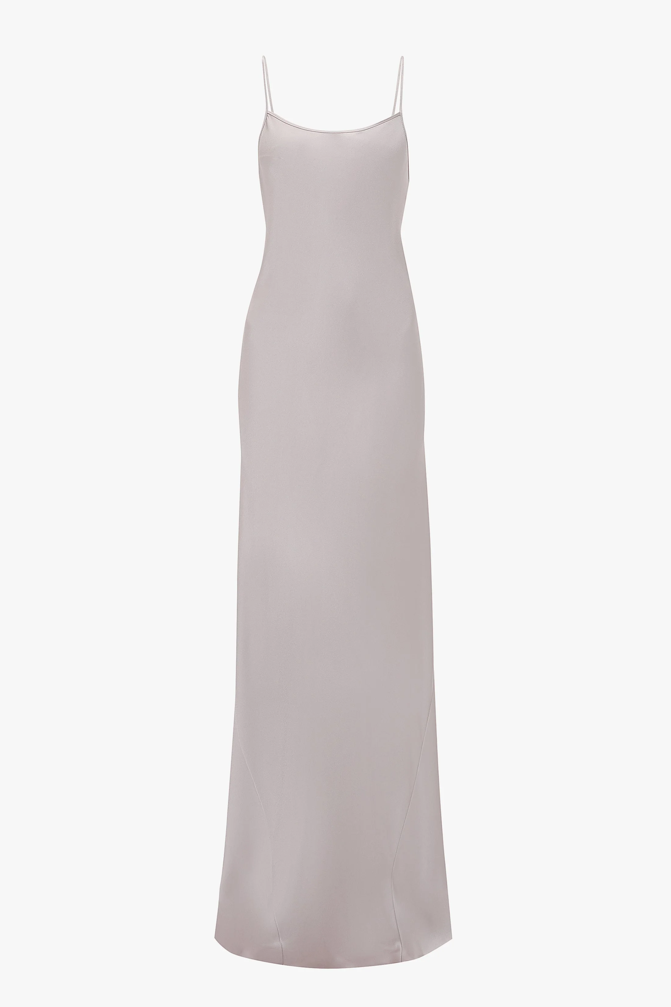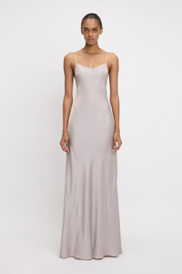 A favourite of Victoria’s, this 1990s-inspired camisole slip dress is crafted from fluid crepe back satin and cut on the bias for a figure-flattering drape. A scooped deep-V at the back with horizontal strap adds a subtle sexiness while a godet insert and mini train add theatrical flair. Presented in a tender shade of Heather, it deftly reimagines nineties retro glamour. Size & Fit - Fits true to size, take your regular size - The model height is 5’11’’/ 180cm and is wearing a size 6 Product Details - Floor length - Deep v-neck with a scooped back - Low back - Bias cut - Back horizontal strap - Back godet skirt deail - Mini train - 71% Acetate 29% Viscose - Dry clean only - Made in UK