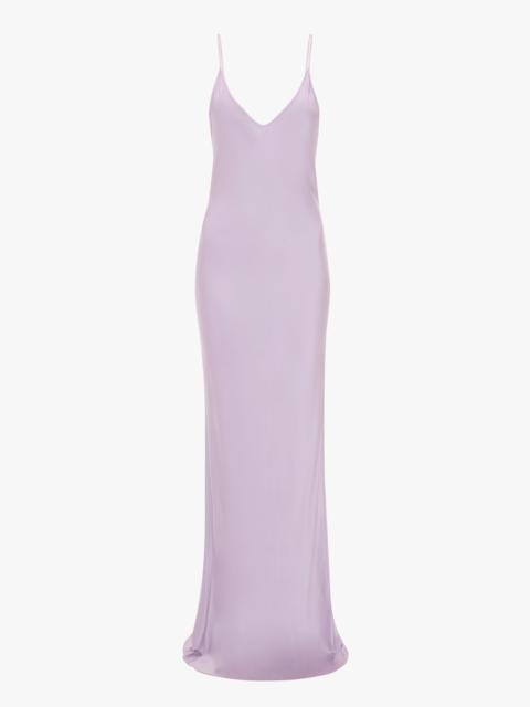 Referencing Victoria’s favourite style decade, this 1990s-inspired camisole-slip dress is crafted from fluid crepe back satin for a sensual lightweight feel. Cut on the bias for a figure-flattering drape, it has a scooped deep-V at the back with horizontal strap for a provocative point of interest and a godet insert and mini train. Presented in a subdued shade of Ice, it deftly reimagines nineties retro glamour. Size & Fit - Fits true to size, take your regular size - The model height is 5’11’’/ 180cm and is wearing a size 6 Product Details - Floor length - Deep v-neck with a scooped back - Low back - Bias cut - Back horizontal strap - Back godet skirt deail - Mini train - 71% Acetate 29% Viscose - Dry clean only - Made in UK