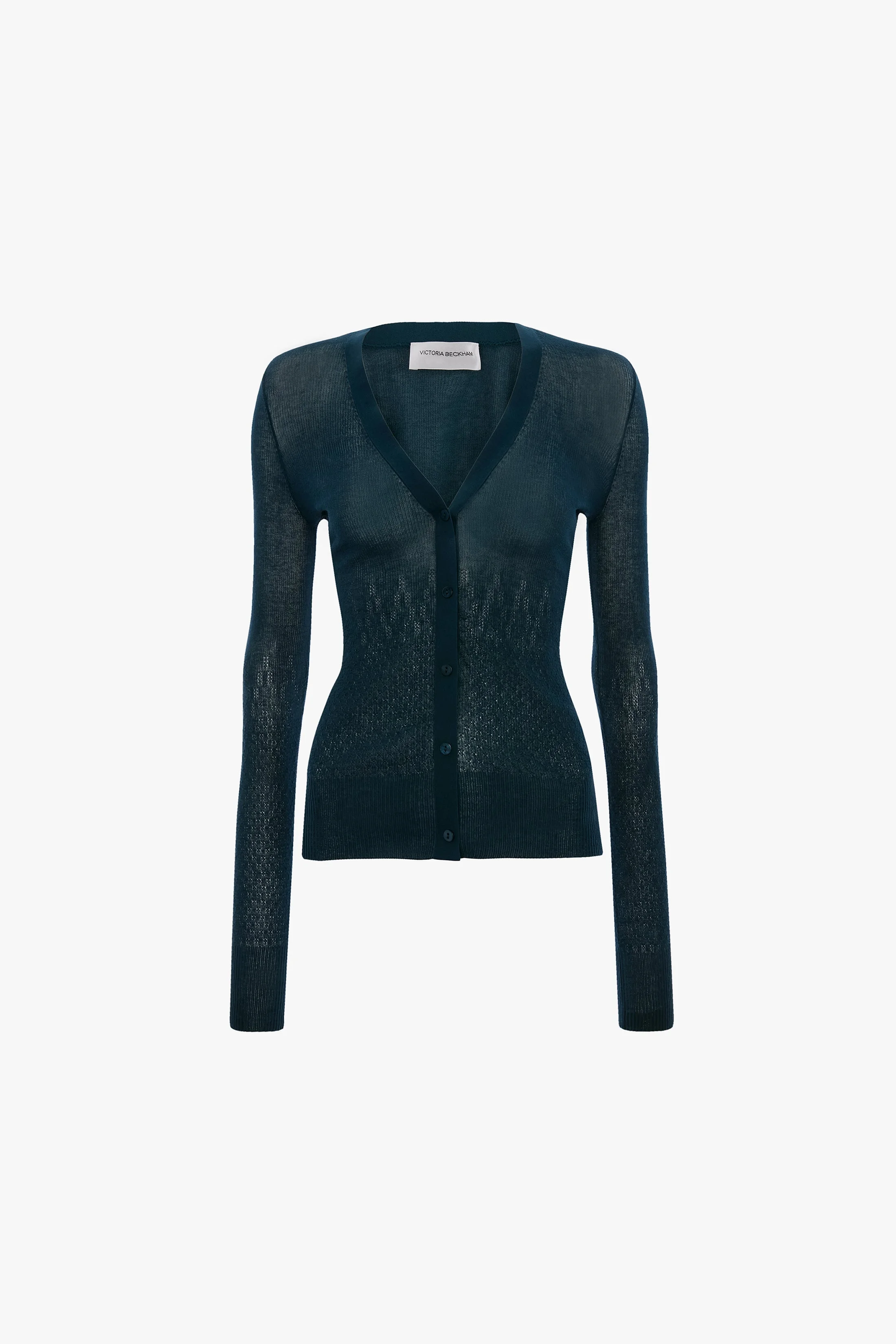 - Fine gauge pointelle knit - Long sleeves with rib cuffs - Low v-neck - Tonal buttons - 85% Cotton 15% Nylon - Made in China A fine-gauge pointelle knit brings a feminine sensibility to this neat Cardigan presented in attractive Teal. Long sleeves, ribbed cuffs and a low V neckline create a classic silhouette, while tonal button closures add an understated finishing touch. SIZE & FIT - The model is 5'10’’/178cm and is wearing a size XS - Fits true to size, take your normal size