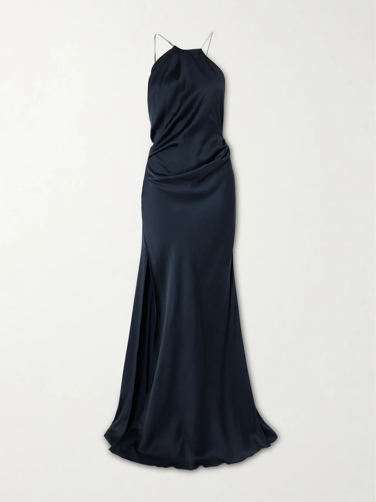 This floor-sweeping gown captures Victoria Beckham's refined take on evening dressing. Draped from lustrous satin, it's finished with a chain strap at the halter neckline that frames the bare back. Gathering at the waist enhances the flattering silhouette.