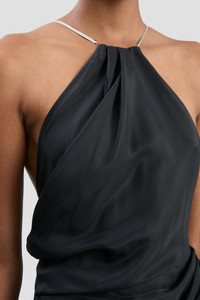- Floral printed viscose fabrication - Floor-length, backless gown - Halter neckline with chain straps - Pleat detailing - Asymmetric hem with train - Skirt side split - Concealed zip with hook & eye closure - Bodice lining - 100% Viscose - Made in UK Crafted from crepe back satin, embellished with silver chain straps and elevated with a backless halter neckline, the Halter Gown is a refined piece of evening wear with a subtly erotic undertone. A floor-pooling hemline and feminine print in Pale Rose add elegant finishing touches. SIZE & FIT - The model is 5'11’’/180cm and is wearing a size 6 - Fits true to size, take your normal size
