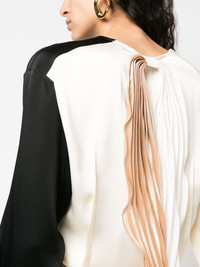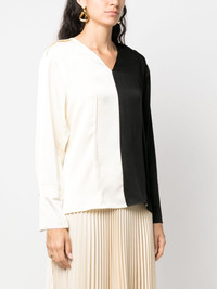 colour-block V-neck blouse Highlights - Black/white - Colour-block design - Pleat detailing - V-neck - Long sleeves - Buttoned cuffs - Straight hem Imported Composition Polyester 100%, Polyamide 90%, Brass 10% SIZE & FIT Model measurements Height 5 ft 10 in(1.79 m) Bust/Chest 33.07 in(84 cm) Hips 35.82 in(91 cm) Waist 24.01 in(61 cm) FittingInformation Designed for a slim fit that sits just away from the body offering a close yet comfortable fit Made from a midweight non-stretch fabric This piece fits true to size – take your usual size Washing instructions Dry Clean Only