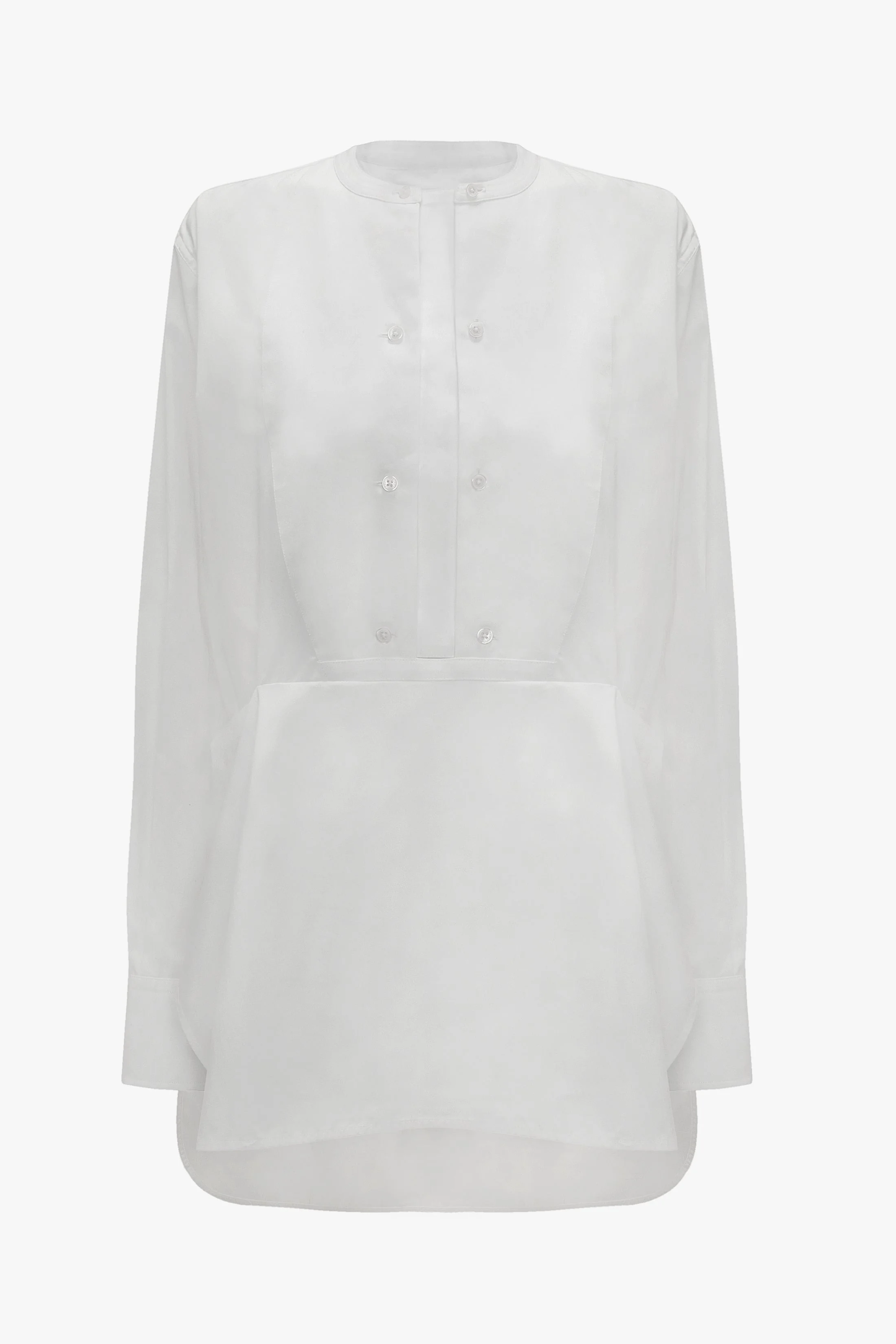 Tuxedo style is given a modern update with a longer-length back hemline and side gusset detail. The Double Bib Detail Shirt also references traditional design codes, such as a front bib detail, half-button placket and granddad collar. Crafted from organic cotton, it has an oversized fit and signature Victoria Beckham embroidered monogram. Size & Fit - Designed to fit oversized. For a more fitted look, take one size down - The model height is 5'11’’/180.5cm and is wearing a size 8 Product Details - Contrast fabric shirt - Bib detail - Half button placket - Button cuff with placket - Grandad collar detail - VB embriodery in contast thread on side gusset - Side gusset detail - 100% Organic Cotton - Machine wash at 30C - Made in Turkey