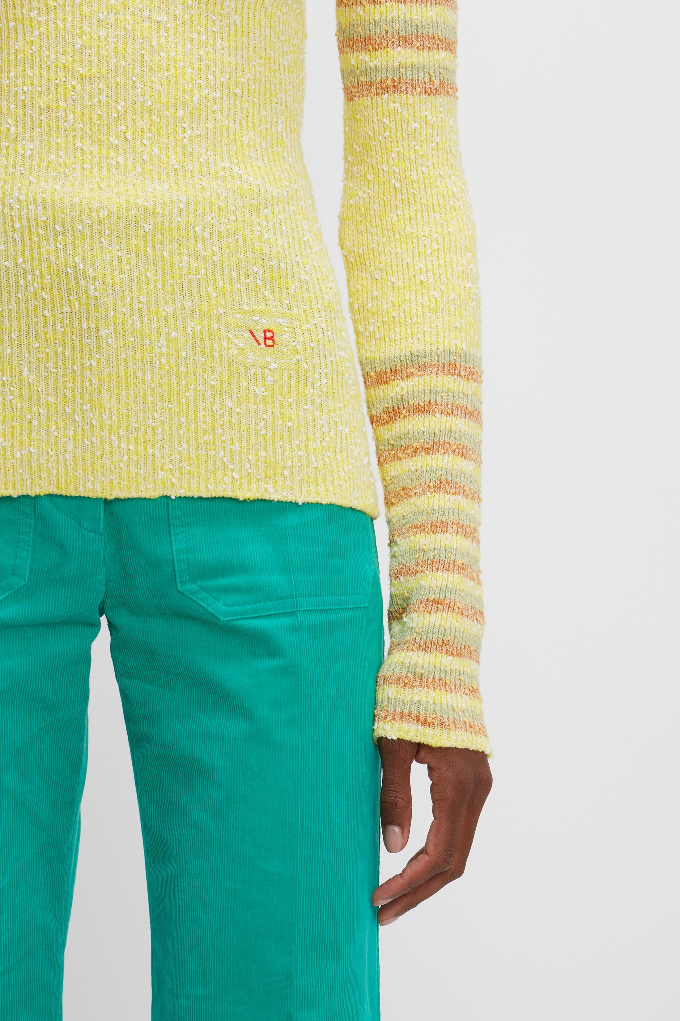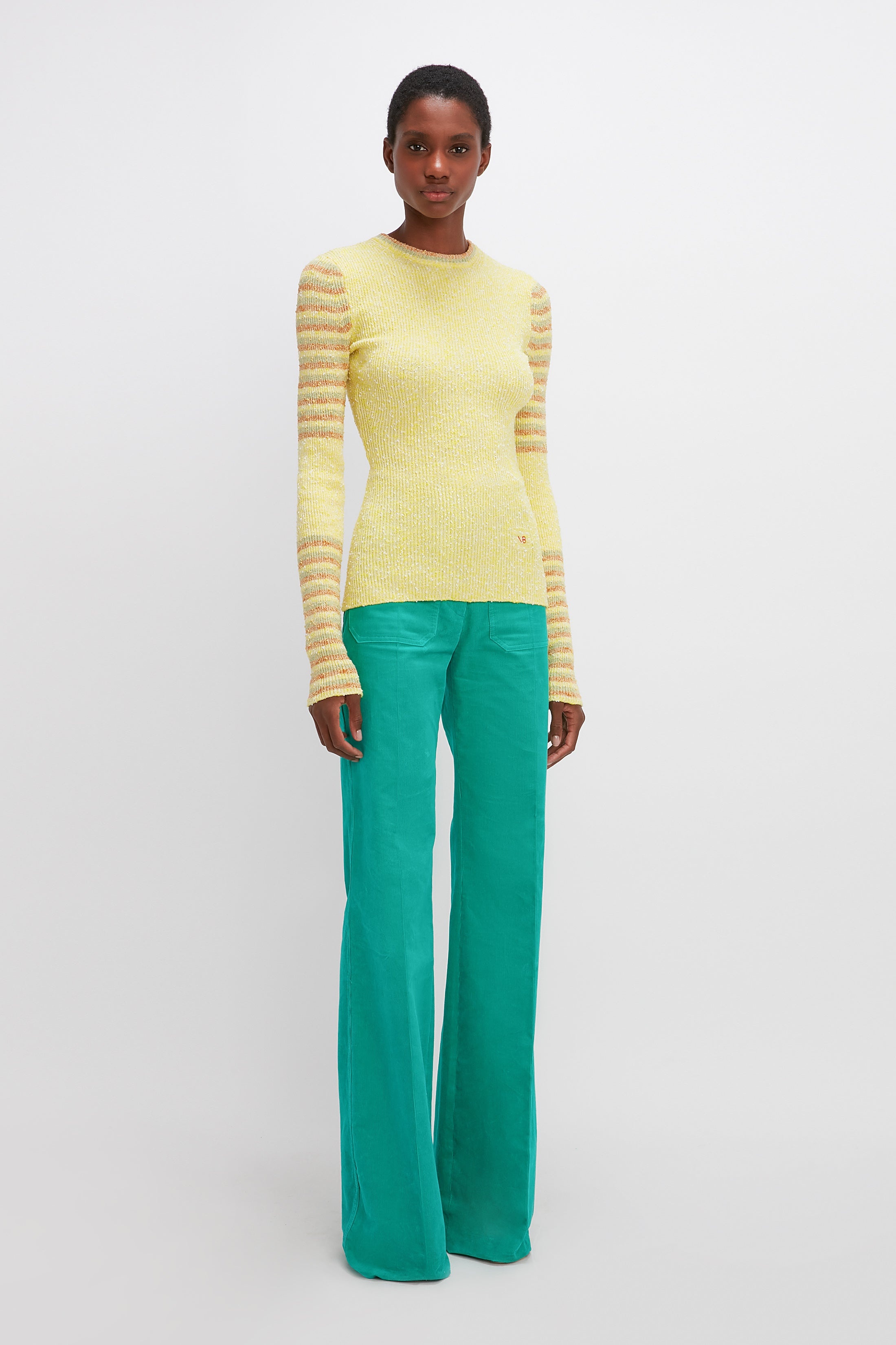 A playful knitwear piece made for everyday styling, the Crew Neck Jumper is cut to sit close to the body, with long sleeves and a round, crew neck. It’s made from a lightweight cotton mix, that combines two yarns for a resulting compact rib bouclé stripe. The design combines a feminine lemon shade with contrasting colour stripes on the sleeves and neckline. A delicate VB embroidery sits on the lower left side, in our signature shade of red. Tuck into high waisted denim, or pair with pop-colour corduroy for more of a statement look. Product Details - Textured Stripe Fabrication - Main: 59% Cotton 27% Polyamide 13% Polyester 1% Elastane - Specialised Dry Clean Only - Iron One Dot - Fitted Silhouette, take your regular size - The model's height is 177cm and is wearing a standard size S