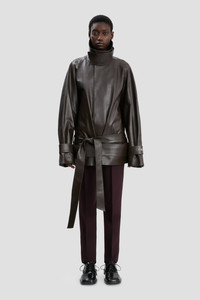 A standout piece from the autumn/winter runway, the Cropped Belted Leather Trench in Dark Chocolate brings fresh personality to utilitarian design codes. Crafted from luxurious nappa leather, it has an oversized fit and a contemporary silhouette characterised by a high collar with throat guard, wide raglan sleeves and mini hemline. Oversized cuff tabs with a metal B trim add visual interest, while a low-rise belt completes the look. Size & Fit - The model height is 5'11’’/180cm and is wearing a size 8 - Designed to fit oversized. For a more fitted look, take one size down Product Details - Calf leather cropped trench coat - Back elasticated channel with belt - Invisible poppers for front fastening - Large cuff tabs with metal B trim - Wide raglan sleeves - 100% Nappa Leather - Leather Specialist Dry Clean Only - Made in Mauritius