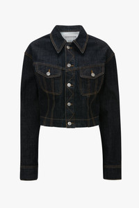 A utilitarian classic is redefined with a feminine silhouette and sophisticated Indigo Rinse in the Cropped Denim Jacket. Crafted from 100% cotton, it has a shortened hemline for a waist-defining cut and exudes the house’s signature refinement. Tobacco topstitching nods to traditional workwear finishes, adding retro appeal. Styled with the Cinched Jean & High Neck Top Size & Fit - The model height is 5'10''/178cm and is wearing a size 6 - Fits true to size, take your regular size Product Details - Indigo denim - Cropped body length - Tobacco topstitching details - Branded silver denim shank buttons - 100% Cotton - Machine wash at 30C - Made in Italy