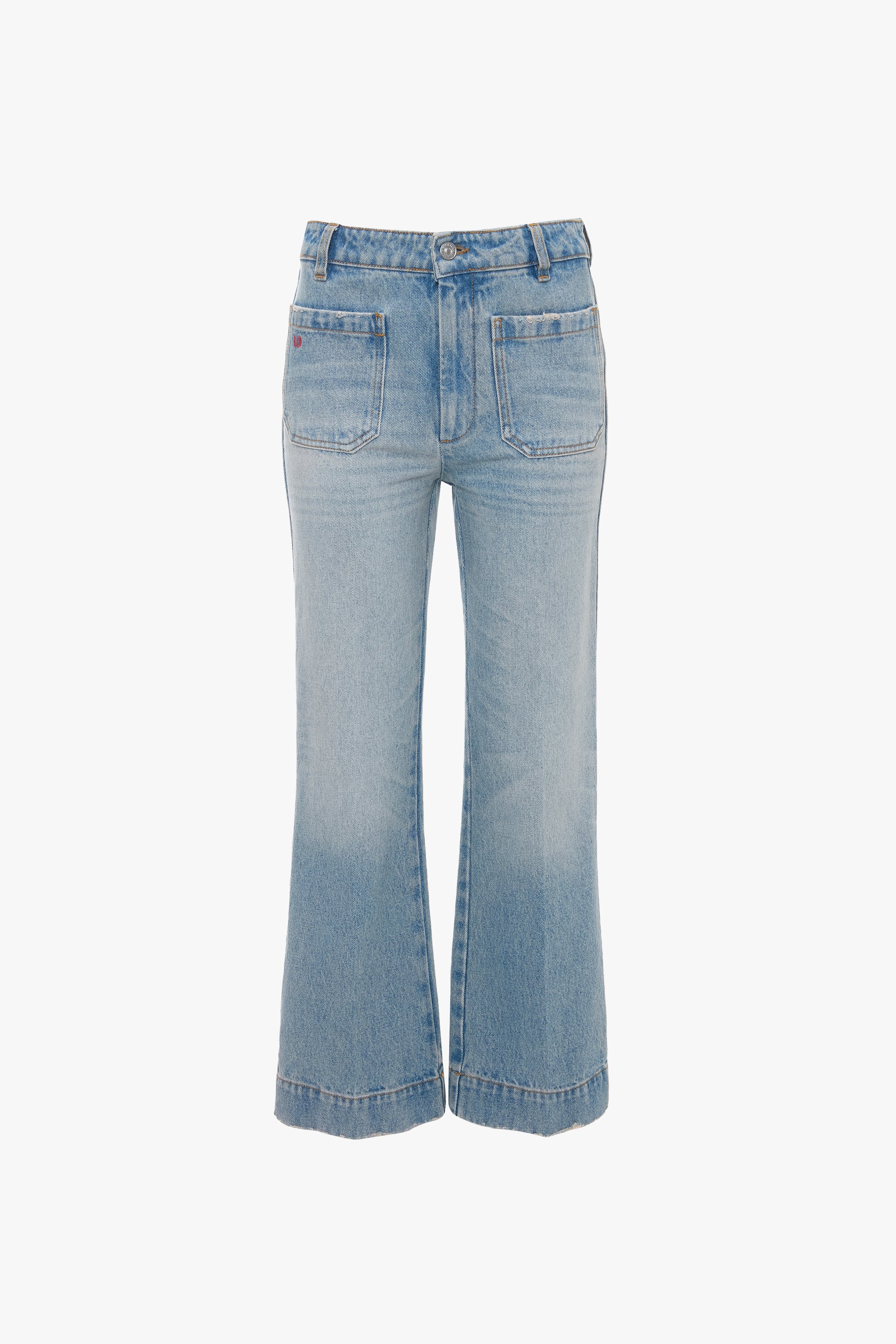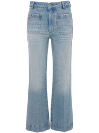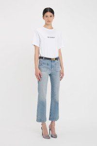 The house's favourite Alina Jean is presented with a cropped kick flare for SS25. Retaining signature Alina design details such as the high waistline and patch pockets, it is refreshed with a flattering ankle-grazing hemline and gently flared silhouette. Presented in a laid-back Pale Blue wash, it is finished with tobacco topstitching, a silver branded denim shank button, a branded leather patch at the back of the waist and a red embroidered Victoria Beckham logo on the front pocket. Size & Fit - Cropped kick flare - Mid-rise - Fits true to size, take your regular size Product Details - Patch pockets on the front and back - Tobacco topstitching details - Red VB embroidery on front pocket - Silver branded denim shank button - Branded leather patch to back waist - 100% Cotton - Machine wash at 30C - Made In Italy