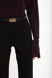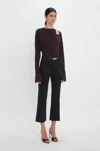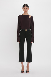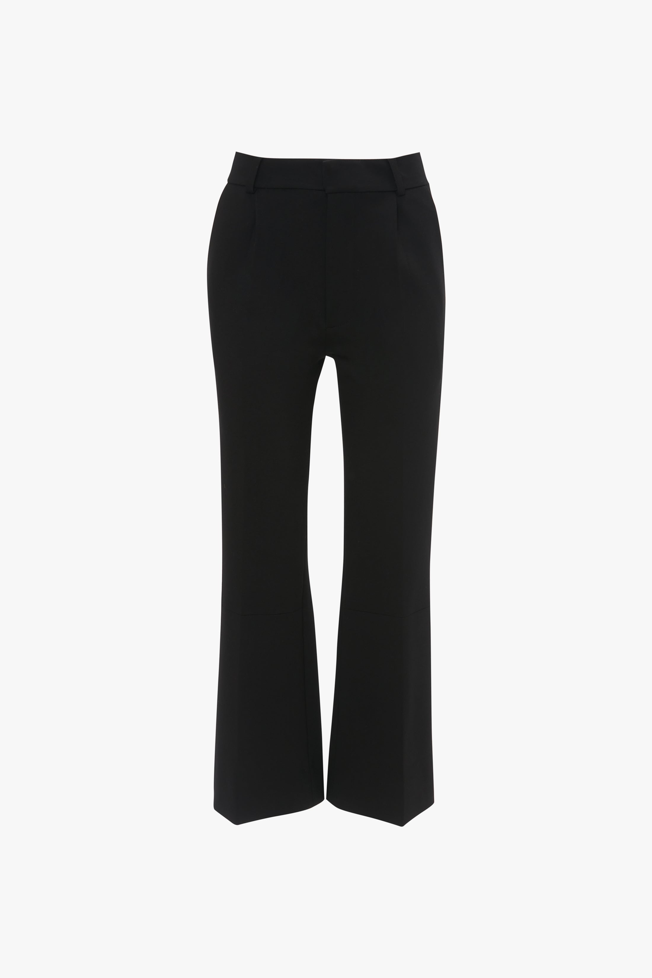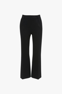 Immaculately tailored trousers are part of the Victoria Beckham brand DNA. Designed to reveal a flattering hint of ankle, these smart trousers have a contemporary kick hem for a more feminine take on the classic black pant. Front and back leg creases have a leg-lengthening effect, while discrete side pockets and welt pockets at the back reinforce the minimalist aesthetic. Styled with the Twist Detail Jersey Top, Frame Belt, Classic Mule, Frame Stud Earrings and the Mini Chain Pouch With Long Strap Product Details - Cropped length - Waistband with 4 belt loops - Front fly with zip - Side front pockets - Back jets pocket - Front and back leg creases - Fits true to size, take your regular size - The model height is 178cm and is wearing a size 6 - 67% Viscose 28% Polyester 5% Elastane - Machine Wash 30C - Made In Turkey