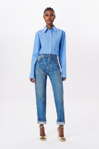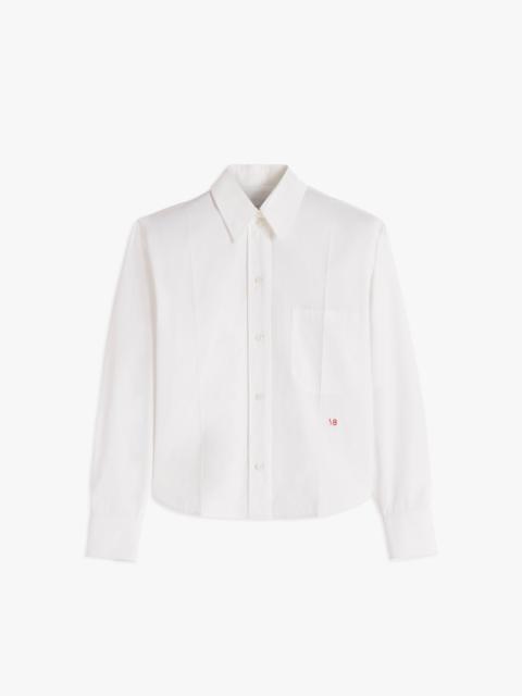 One of several new shirting shapes this season, this Cropped Long Sleeve Shirt in Oxford Blue features a boxy fit that feels refreshing and modern. Made from cotton poplin, it is finished with an embroidered VB monogram on the front, a patch pocket on the left, and a back box pleat for a touch of structure. Product Details - Cotton Poplin Fabrication - Fits large. Customers might wish to take a smaller size for a less oversized look - Boxy Fit Silhouette - Garment Length (Shoulder to Hemline): 59cm - Sleeve Length (Shoulder to Cuff Edge): 59cm - Made in Turkey - Main: 100% Cotton - Button: 75% Polyester, 25% Recycled Polyester - Machine wash, iron one dot - The model is a standard IT 40 which equals a UK size 8