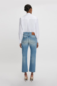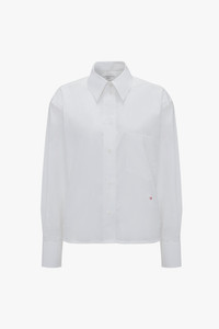Signature shirting is part of the Victoria Beckham brand DNA. Discreet but elevated detailing defines this contemporary take on the classic white shirt. Crisp pleating along both sleeves creates architectural points of interest, while a contrasting VB monogram in red stitching adds sophisticated polish. Size & Fit - Front length side neck point to hem: 58cm sleeve length from shoulder: 58cm - Cropped length - Relaxed fit - The model height is 180cm and is wearing a size 6 Product Details - Organic Cotton Poplin Fabrication - Drop shoulder design - VB monogram embroidery on bottom left hand side - 100% Cotton Poplin - Machine Wash 40C - Made in Turkey