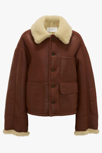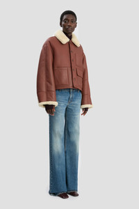 Traditional utilitarian outerwear is given the house’s signature polish in the Cropped Shearling Jacket. Crafted from butter-soft leather, it has a contemporary oversized fit and a cropped hemline for a figure-flattering silhouette. Exposed shearling at the collar and cuffs add a tactile finishing touch, while a metal B trim on the cuffs adds visual interest. Practical patch pockets complete the look. Size & Fit - Designed to fit oversized. For a more fitted look, take one size down - The model height is 5'10.5’’/178cm and is wearing a size 8 Product Details - Workwear style shearling jacket - Exposed shearling - Denim shank button closure - Patch pockets - Metal B trim detail - 100% Lamb Shearling - Leather specialist dry clean only - Made in Greece