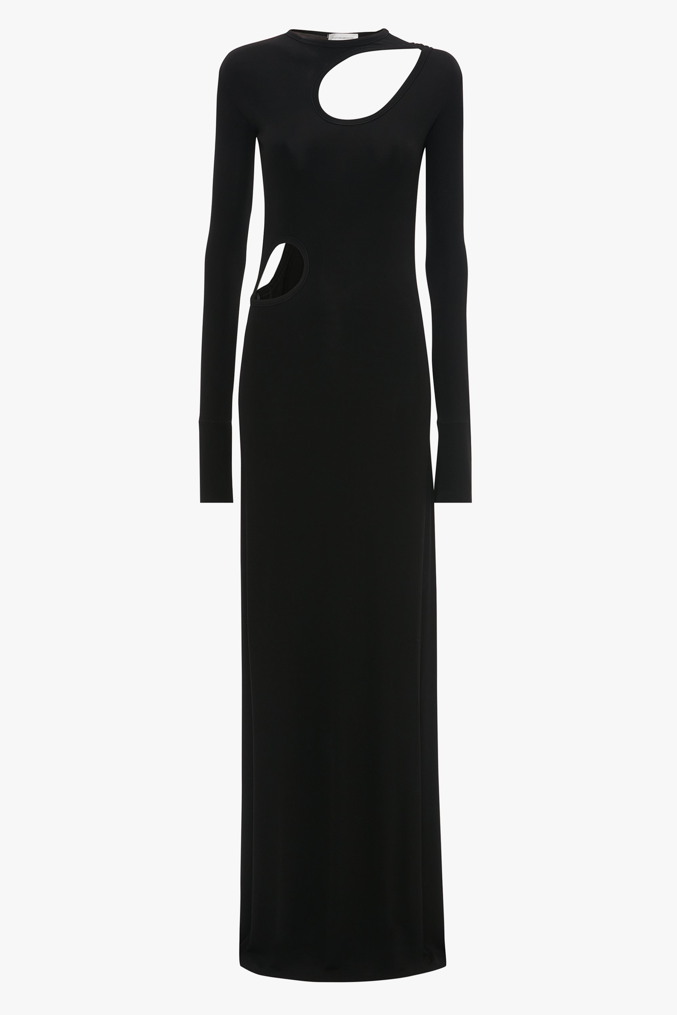 Evening gowns that reflect a modern sensibility are a signature of the Victoria Beckham brand. Crafted in liquid crepe jersey for a body-skimming effect, the Cut-Out Jersey Floor-Length Dress in classic Black embodies an understated sophistication. Provocative cut-out details at the neck and waistline and a side seam split in the skirt punctuate the otherwise demure silhouette. A shoulder zip and side split cuffs complete the look. Styled with the Frame Stud Earrings and Frame Bracelet Product Details - Stretch jersey fabrication - Cut out details at neckline and waist - Fitted sleeve with splits at cuff - Side seam split in the skirt - Zip at shoulder - Fits true to size, take your regular size - The model height is 178cm and is wearing a size 6 - 96% Viscose 4% Elastane - Dry Clean Only - Made In Portugal