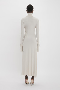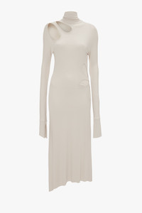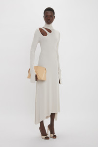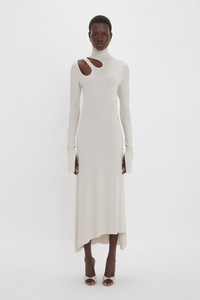 The liquid crepe jersey fabrication of the Long-Sleeve Cut-Out Jersey Midi Dress glides easily around the body for a shapely silhouette. A demure polo-neck design is balanced by directional cut-out details at the front shoulder, while an asymmetric hemline and split sleeves at the cuff add playful points of interest. Finished with a discreet flower motif at the hip, it embraces the house’s polished sophistication. Styled with the Frame Stud Earrings and Victoria Clutch Bag Product Details - Stretch jersey fabrication - High neckline with zip at shoulder - Cut out details on front shoulder - Flower detail on left bodice - Dropped shoulder - Fitted sleeve with splits at the cuff - Asymmetric hem - Fits true to size, take your regular size - The model height is 176cm and is wearing a size 6 - 96% Viscose 4% Elastane - Dry Clean Only - Made In Portugal