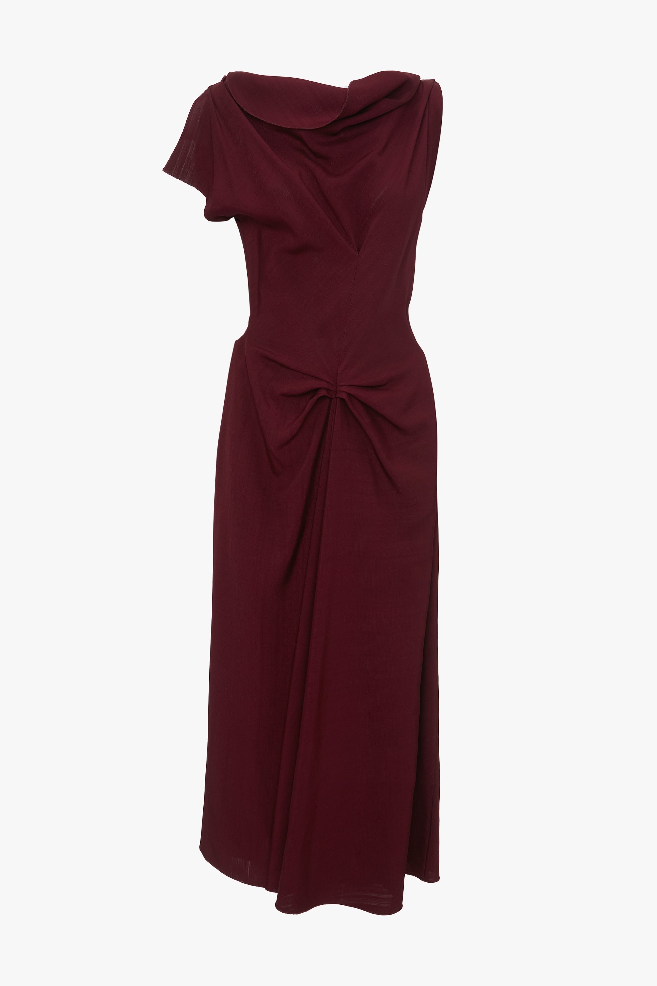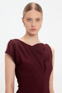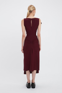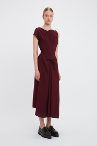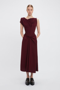An AW24 runway highlight, the Deconstructed Gathered Waist Midi Dress takes a signature house style in a new direction. An elegant drape detail at the neckline and unexpected keyhole opening at the back bodice add unique points of difference, while pleat detailing at the front waist and back hip bring a sensuous tactility. Fitted at the waist but with a more relaxed cut through the bodice and skirt, this midi dress exudes effortless sophistication. Styled with the Exclusive Resin Pendant Earrings Product Details - Soft drape at the front neckline - Pleat detail on the waist and back - Front skirt drape with aymmetric hem - Fitted around the waist - Concealed front pockets - Contrast topstitch details - Keyhole opening at the back with hook & eye closure - The model is 178cm and is wearing a size 6 - 100% Viscose - Dry clean only - Made in Portugal - Concealed zip with hook and eye closure