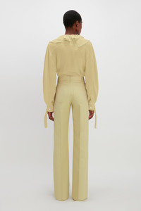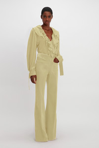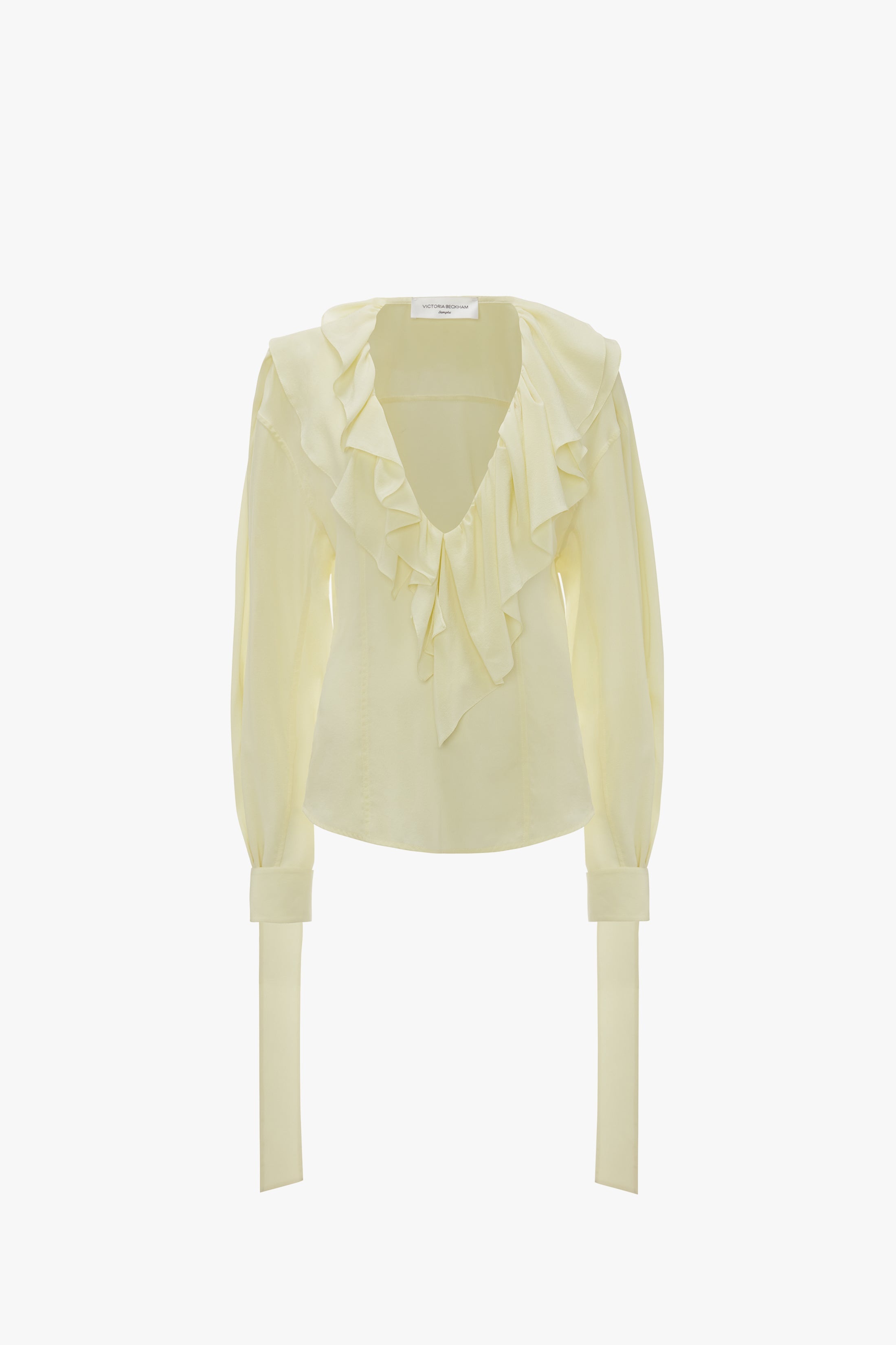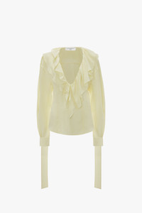 Feminine and elegant, the Deep V Ruffled Blouse is a key piece this season. Made from 100% silk crepe-de-chine, it is effortlessly fluid, with a soft, washed finish. Cut with long sleeves and a deep V-shaped neckline that’s framed with a statement layered ruffle trim, additional detail comes in the form of tie-detail cuffs that can be knotted to hang loosely, or tied into a bow depending on your preference. Style with the colour-coordinated suit – the palette references the 1908s neo-noir classic American Gigolo, a key inspiration for this season. Product Details - Blouse Fabrication - Main: 100% Silk - Specialised Dry Clean Only - Iron One Dot - Fits true to size, take your regular size - The model's height is 177cm and is wearing a UK size 8