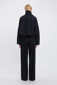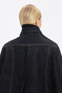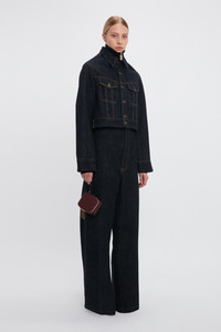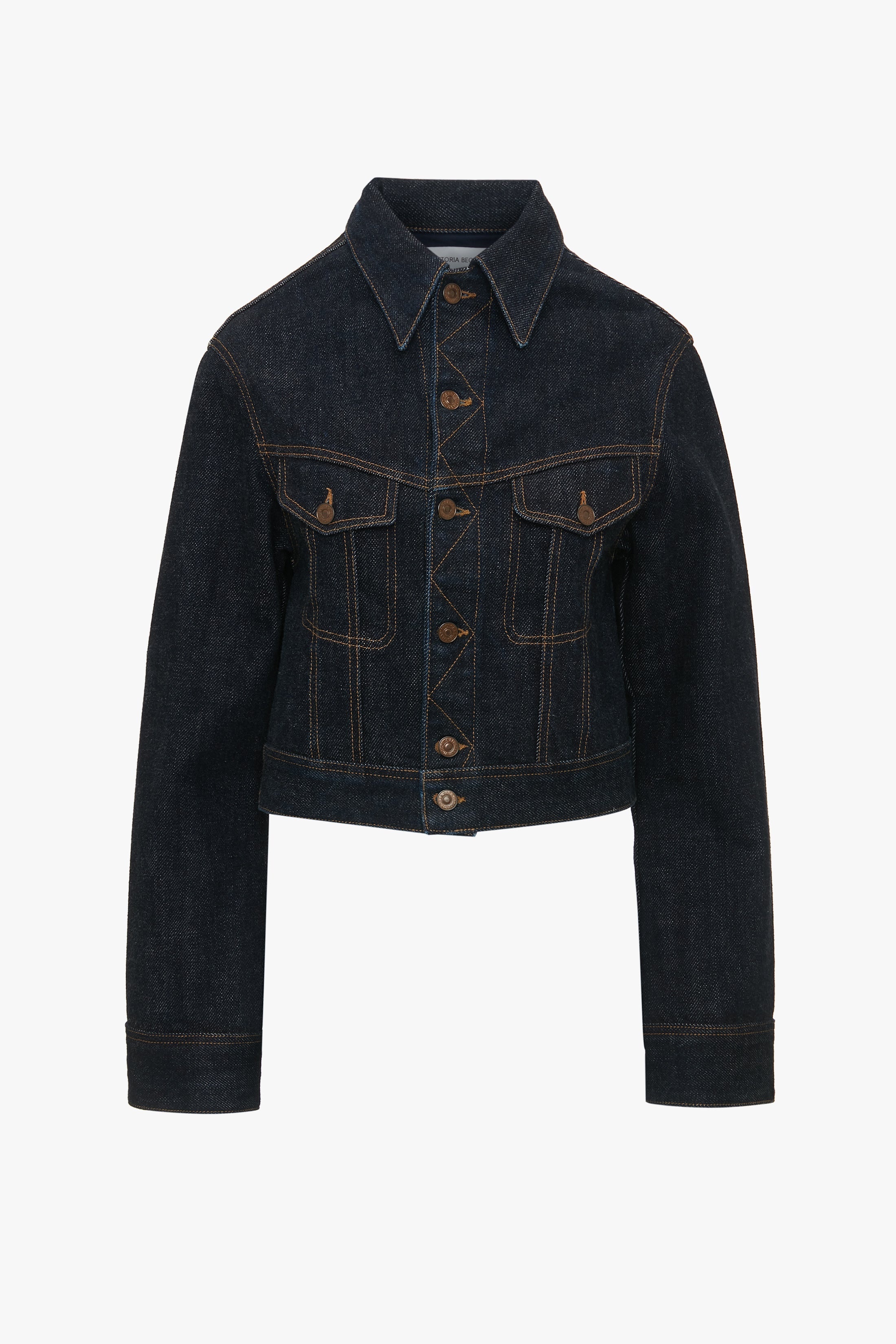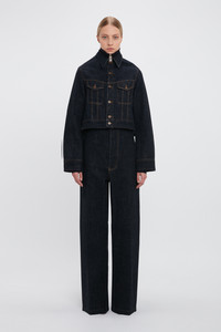 An AW24 runway highlight, the Cropped Denim Jacket is meticulously crafted from resinated denim for a structured silhouette and glossy finish. Offering polish and practicality, it has front chest pockets with branded denim shank buttons and traditional tobacco topstitching. An exposed dart detail at the shoulder, flared hem at the back and asymmetric seams add feminine points of difference to this hardworking wardrobe essential. Product Details - Resinated denim with a dark indigo rinse - Exposed dart detail at the shoulder - Front closure with branded denim shank buttons - Chest pockets - Flared hem at back with asymmetric seams - Tobacco topstitching details - The model is 177cm and is wearing a size 6 - 100% Cotton - Machine wash 30C - Made in Italy