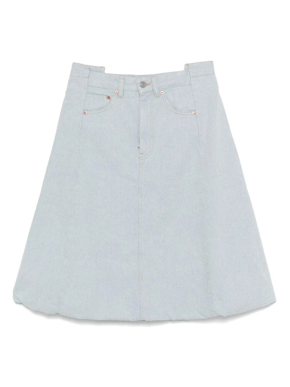 denim midi skirt Highlights - Light blue - Concealed fly and button fastening - Belt loops - Classic five pockets - Puffball design Made in Italy Composition Lining: Cotton 100%, Polyester 65% Outer: Recycled Cotton 60%, Cotton 40% SIZE & FIT Model measurements Height 5 ft 10 in(1.77 m) Bust/Chest 32.28 in(82 cm) Hips 35.03 in(89 cm) Waist 25.19 in(64 cm) FittingInformation This midi-length skirt is intended to be worn just below the waist Sturdy and hard-wearing, this denim piece offers no stretch