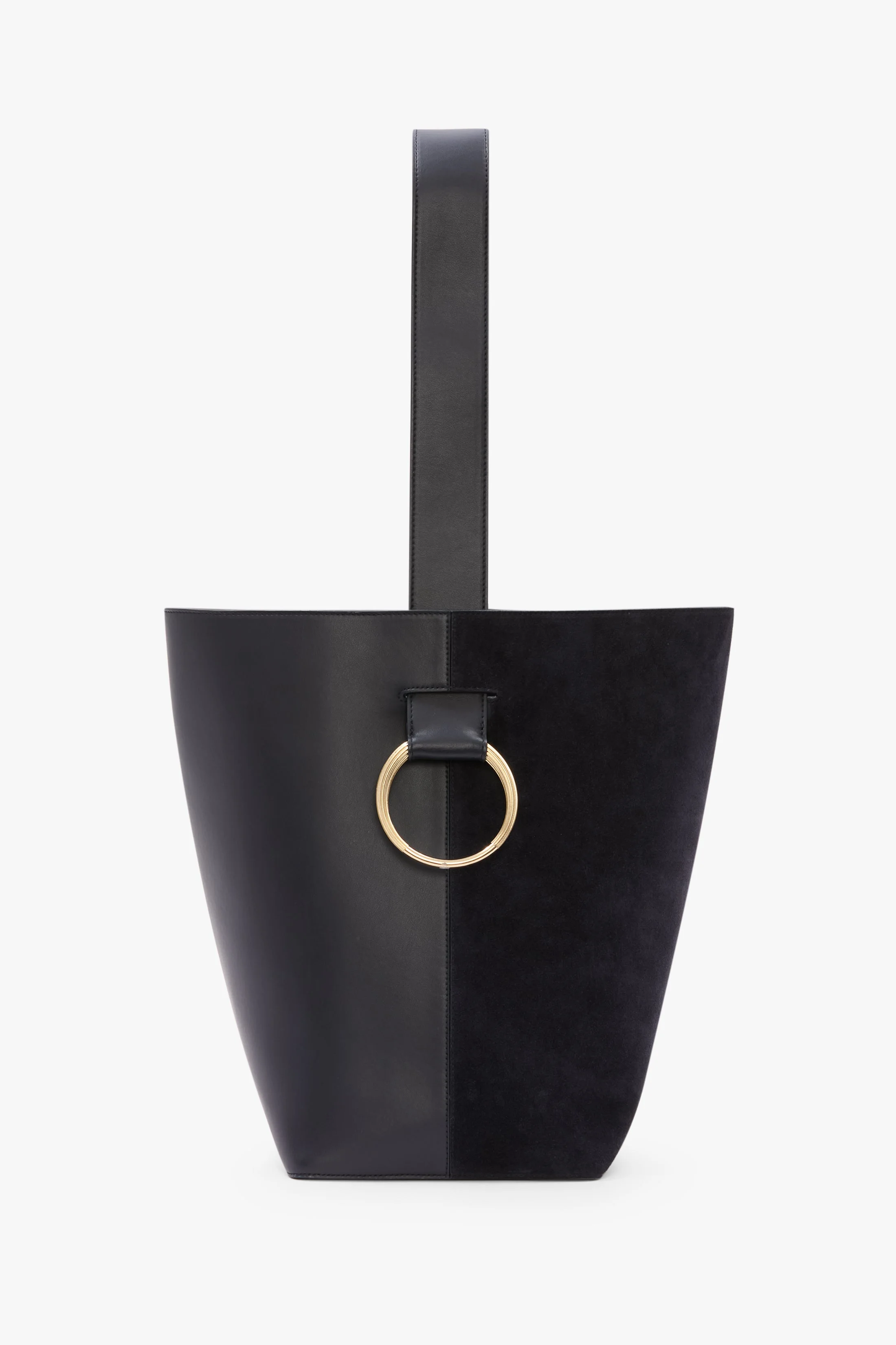 - Cufflink ring hardware - Tonal suede lining - Internal flat pocket - 100% Calf Leather - Product Care: Gently brush off any loose dirt with a soft brush, or wipe the entire surface with a clean, damp cloth. Avoid brushing too hard. Do not apply any leather conditioner or polish, as this may discolour the suede and alter its soft texture. - Made in Italy Cufflink-inspired gold hardware and a rounded silhouette give the The Dia Bucket Bag its distinctive appearance. Practical features include a shoulder strap and internal flat pocket for secure storage. Crafted from suede leather and presented in Navy, it is finished with a tactile tonal suede lining. SIZE & FIT - Height: 35cm, Width: 25cm, Depth: 19cm - Strap: 33cm