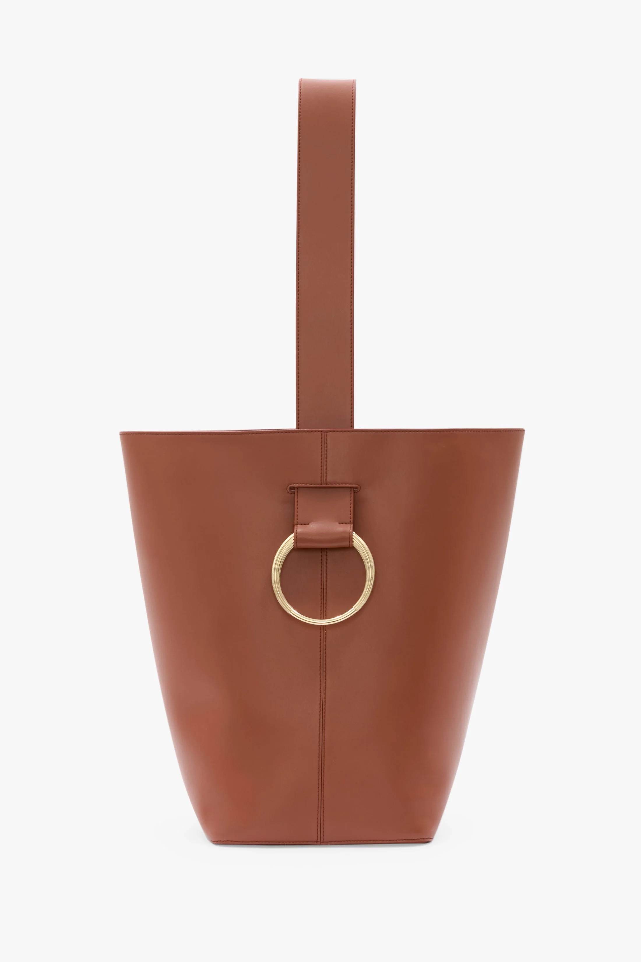 Blending masculine details and feminine curves, the Dia Bucket Bag In Tan leather is distinguished by its cufflink-inspired gold hardware and rounded silhouette. Practical design features include a convenient shoulder strap and internal flat pocket for secure storage. Crafted from matt calf leather, it is finished with a tactile tonal suede lining. Size & Fit - Height: 35cm, Width:25cm, Depth:19cm, Drop With Strap: 33cm Product Details - Cufflink ring hardware - Matte calf body, 100% Leather - Tonal suede lining - Internal flat leather pocket - 100% Leather - Wipe clean with a soft, dry cloth - Made in Italy