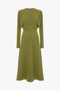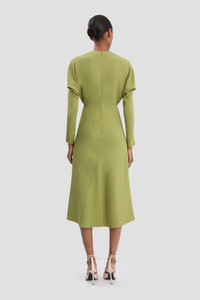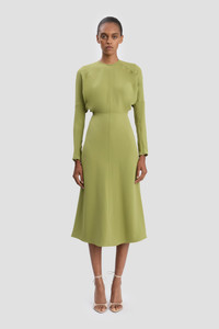 - Dolman sleeve midi dress - Round neckline - Draped underarm feature - Zip sleeve opening - Tonal topstiching - Concealed back zip - 50% Viscose 47% Acetate 3% Elastane - Made in Lithuania A signature silhouette in the house’s archive, the Dolman Midi Dress in Greenfinch is crafted from a fluid cady fabric and has elegant long sleeves, a discreet round neckline and softly defined waist. Concealed zips at the wrist and voluminous underarm drape add attractive talking points, while tonal topstitching brings visual interest. SIZE & FIT - The model is 5'11’’/180cm and is wearing a size 6 - Fits true to size, take your normal size - Fitted around the hip and more relaxed through the bodice