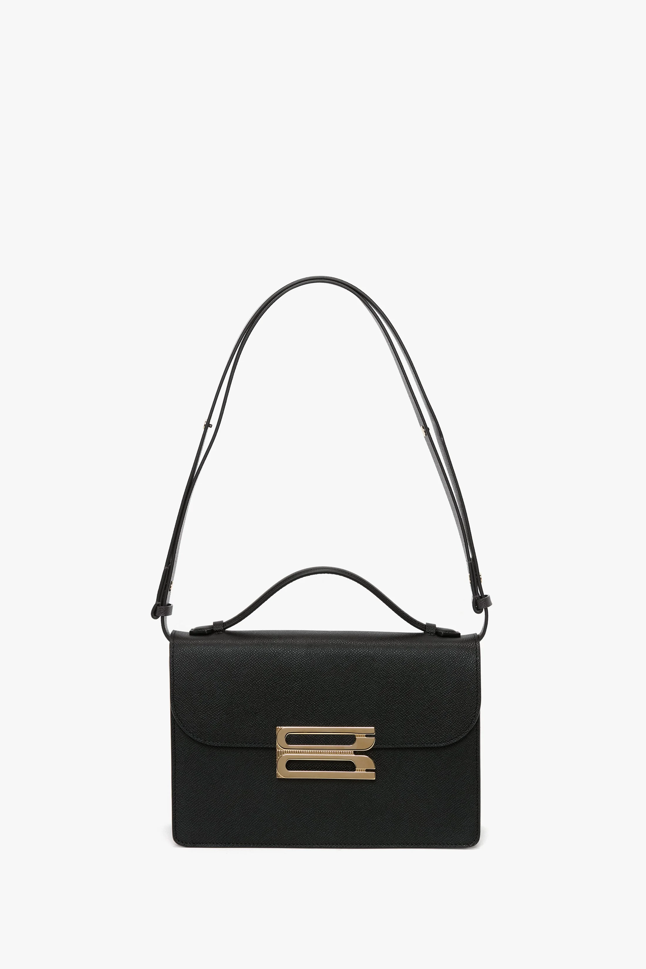 - New B frame locking system - Smart strap allows for multiple wearing options - Internal double compartment - Features our signature gold branding with VB logo and a unique code - Microsuede lining - 100% Calf leather - On calf leathers, regularly apply a small amount of nourishing cream and buff gently using a cloth - Made in Italy With its clean lines and slender silhouette, the Dorian Bag appeals to a multi-generational customer and is a hero item in the house’s leather goods edit. Crafted from tactile grained leather and designed in classic Black, it features the brand’s signature B buckle, which has been reworked to create a dynamic new locking system, and benefits from a removable and adjustable ‘smart strap’ and snap buttons for versatile styling as a shoulder or crossbody bag. Lined in microsuede, it has an internal double compartment and small flat leather pocket for secure storage and is finished with the discreetly stamped address of Victoria’s London studio (N.202) followed by a unique serial number. SIZE & FIT - Height: 16.5cm, Width: 25cm, Depth: 8.5cm. - Fits: Up to iPhone Pro Max, Card Holder, Airpods, Sunglasses