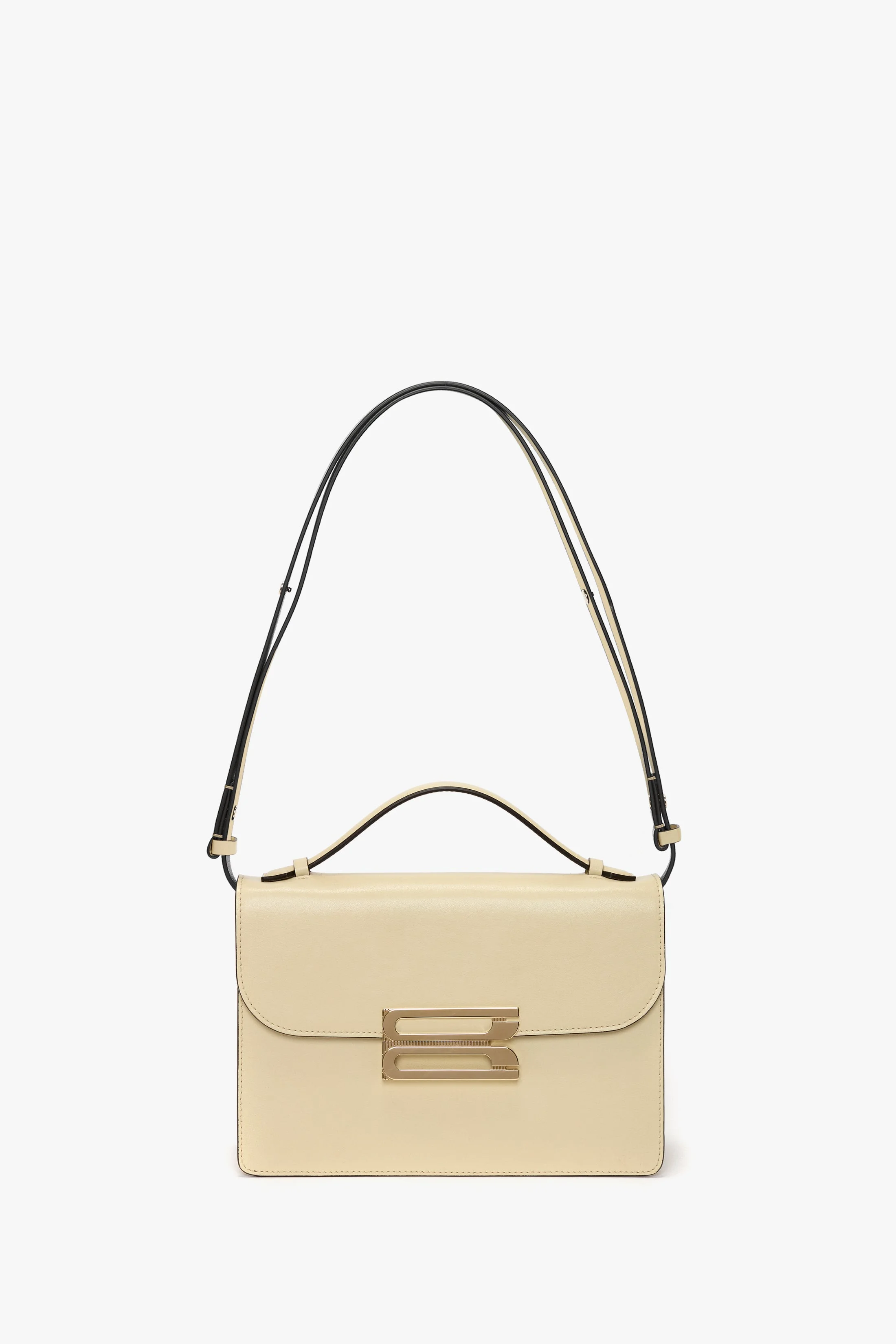 The Dorian Bag is reframed in silky smooth leather and a romantic shade of Ivory. Featuring the brand’s signature B buckle, which has been reworked to create a dynamic new locking system, it also benefits from a removable and adjustable ‘smart strap’ and snap buttons for versatile styling as a shoulder or crossbody bag. Lined in microsuede, it has an internal double compartment and small flat leather pocket for secure storage. With its slender silhouette and discreetly stamped address of Victoria’s London studio (N.202) followed by a unique serial number, it is a professional and polished proposition for the new season. Size & Fit - Height: 16.5cm, Width: 25cm, Depth: 8.5cm. Product Details - New B frame locking system - Smart strap allows for multiple wearing options - Internal double compartment - Features our signature gold branding with VB logo and a unique code - Microsuede lining - Shiny calf leather - 100% Calf leather - On calf leathers, regularly apply a small amount of nourishing cream and buff gently using a cloth - Made in Italy
