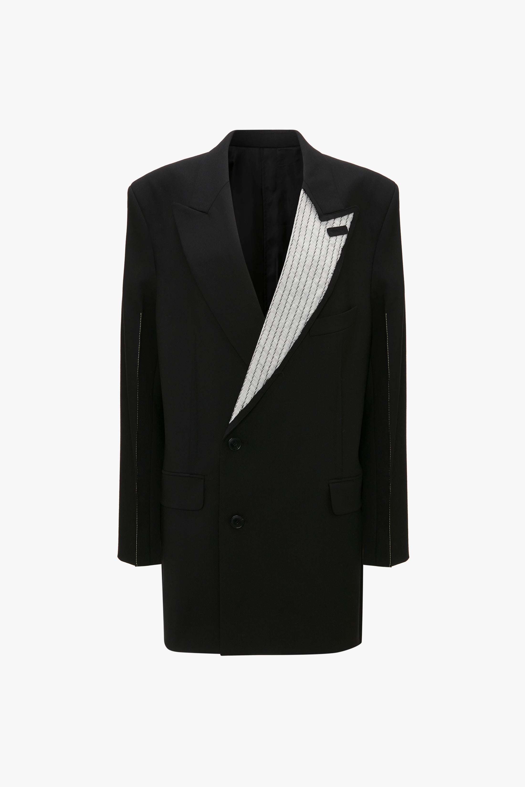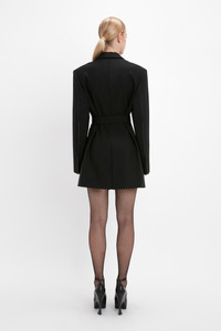 Modern sexiness defines this masculine-inspired mini dress. Exquisitely tailored with an oversized shoulder for a confident, contemporary silhouette, exposed internal canvas detailing on the left lapel and visible seams on the sleeves add elevated points of interest. A textured belt with signature gold hardware completes the look. Styled with the and Platform Croc Wedge Product Details - Fluid Wool Blend Fabrication - Double breasted tailored jacket dress - Exposed internal canvas detailing on left lapel - Raw edge finishing on lapel - Oversized Shoulder - Frontal button closure - Belt with D-ring design - White contrast topstitching detailing - Fits true to size, take your regular size - The model height is 180cm and is wearing a size 8 - Front Length (Side Neck Point To Hem): 89cm - Main: 53% Polyester 43% Virgin Wool 4% Elastane - Specialised Dry Clean Only - Made in Portugal
