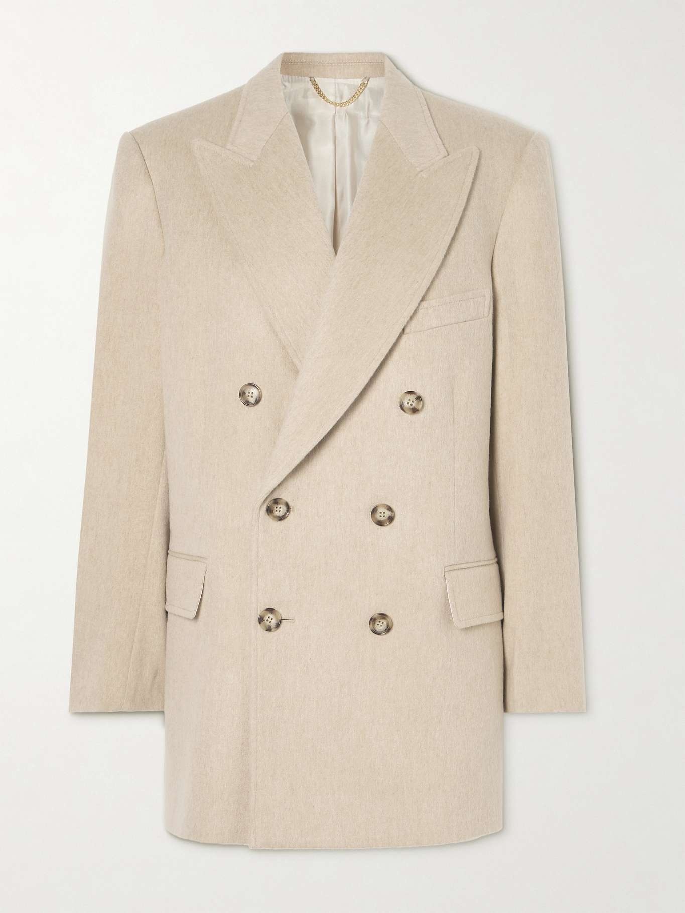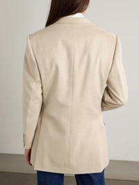 EDITORS'NOTES The fuzzy texture of Victoria Beckham's jacket puts a modern twist on its timeless tailored shape. It's made from a soft blend of wool and cashmere and cut in a double-breasted silhouette, framed by sharp padded shoulders and peak lapels. Take cues from the brand and style yours with tonal separates. SIZE & FIT Model measurements: - Fits true to size, take your normal size - Designed for a slightly loose fit - Internal shoulder pads - Mid-weight, non-stretchy fabric - Model is 180cm/ 5'11" and is wearing a UK 8 - Bust: 81cm/ 32” - Waist: 65cm/ 25.5” - Hip: 90cm/ 35.5” DETAILS & CARE - Beige wool and cashmere-blend - Button fastenings through double-breasted front - 90% wool, 10% cashmere; lining: 100% viscose - Dry clean - Designer color: Bone