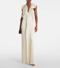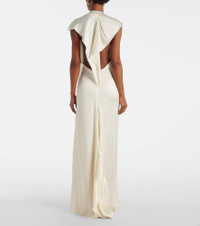 Crafted from flowing satin, this gown from Victoria Beckham is cut to floor length and features elegant draping at the top. The design is complete with cap sleeves and a deep V-neckline for added sophistication. Product Details - Material: 71% acetate, 29% viscose - Care instructions: dry clean - Made in Portugal - Designer color name: Ivory - Item color: white - Closure: invisible zipper - Item number: P01044240 Size & Fit - True to size - Low back - Cinched waist - Non-stretchy fabric - slit length 40,0cm-15.5" - The model seen in the picture is 178cm-5'10" and wearing a size UK 8