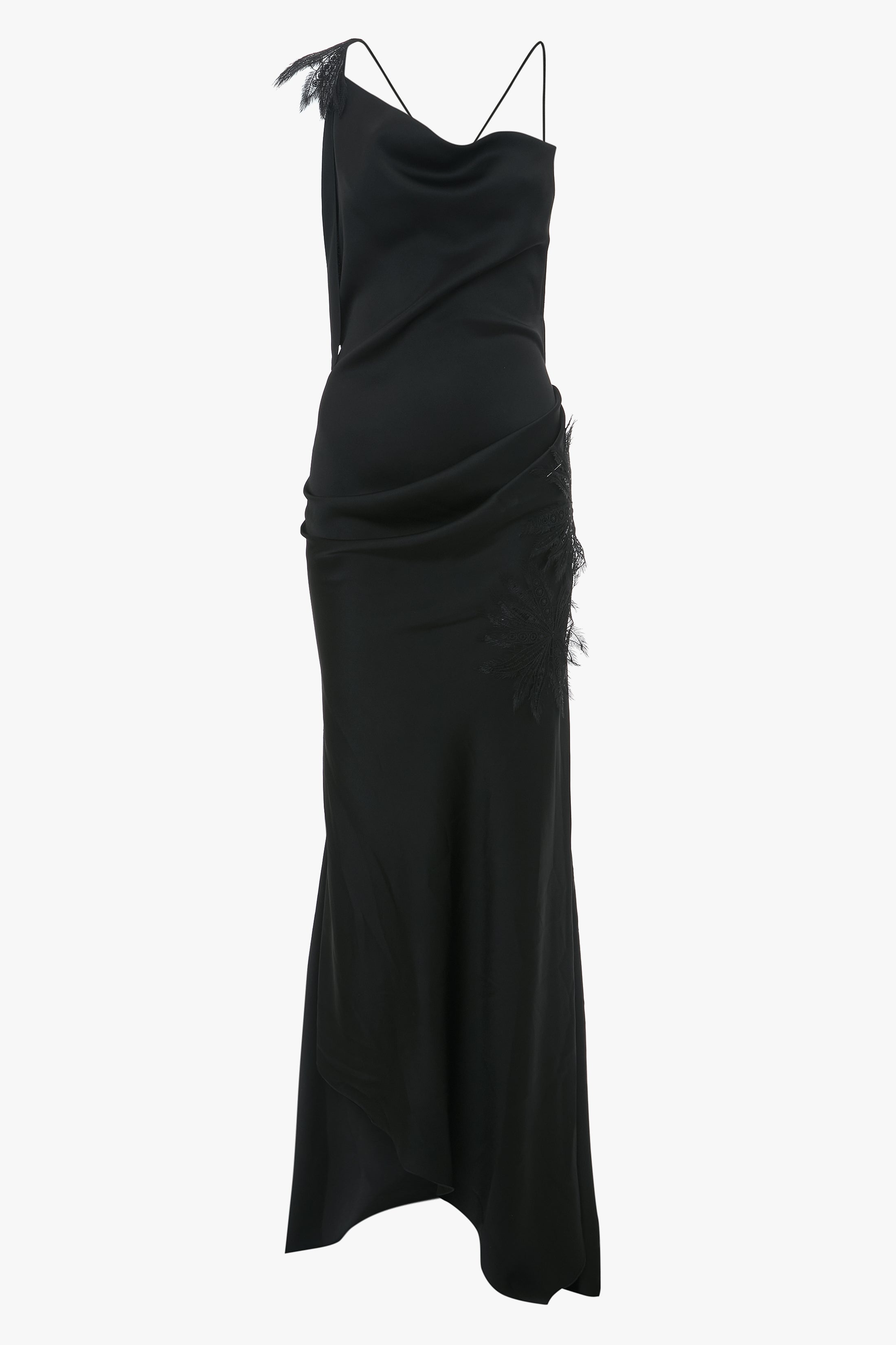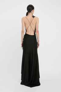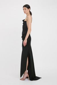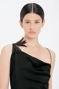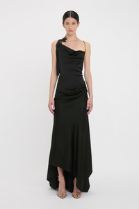 A personal favourite of Victoria’s, the Asymmetric Draped Cami Gown in classic Black reimagines the 1990s slip dress with contemporary detailing. An asymmetric neckline and asymmetric hemline with train at the back elevates the silhouette, while floral lace applique adds a feminine sensibility. A soft drape at the front bodice adds visual interest and an open back punctuated by rouleau straps brings a seductive finishing touch. Size & Fit - Fits true to size, take your regular size - The model height is 5'10''/179cm and is wearing a size 6 Product Details - Asymmetric neckline - Drape details to front bodice and skirt - Floral lace applique - Rouleau straps that extend into ties - Asymmetric hem with train at the back - Concealed zip closure with hook and eye at side seam - 71% Acetate 29% Viscose - Dry clean only - Made In Portugal