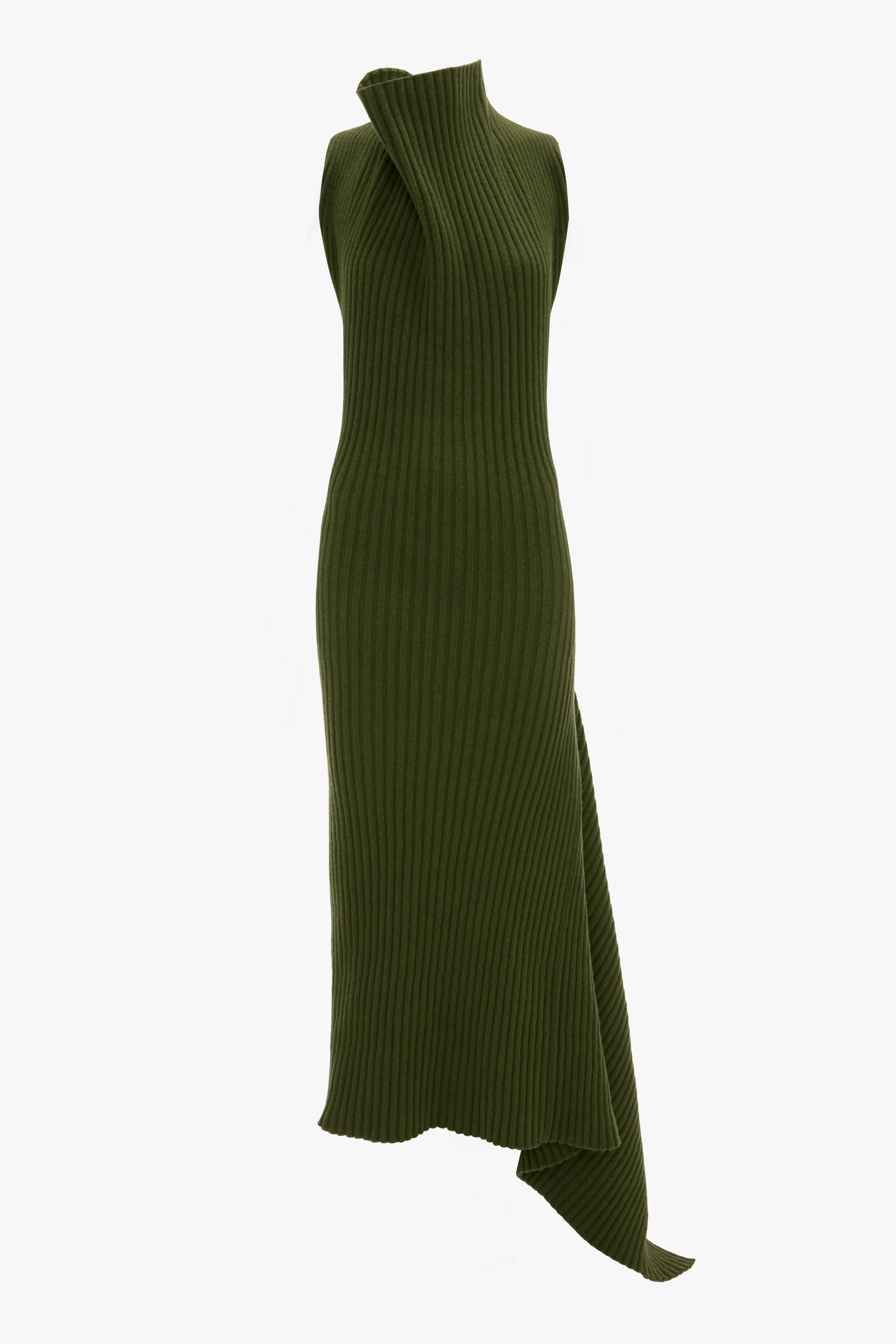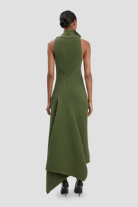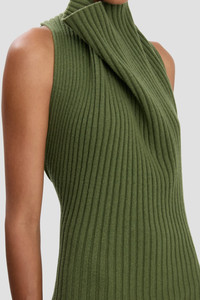 Exuding an understated sophistication, the Draped Sleeveless Rib Midi Dress is crafted from a lambswool blend and designed with a chunky ribbed stitch for a tactile finish. An architectural cowl-front neck and an asymmetric hemline add energy to an otherwise sleek silhouette, while the subdued shade of Oregano gives it wear-anywhere appeal. Size & Fit - The model height is 5'11’’/180.5cm and is wearing a size S - Fits true to size, take your regular size Product Details - Chunky rib stitch - Draped cowl neckline - Asymmetric hem - Lambswool yarn - 80% Lambswool 20% Polyamide - Dry Clean Only - Made in Italy