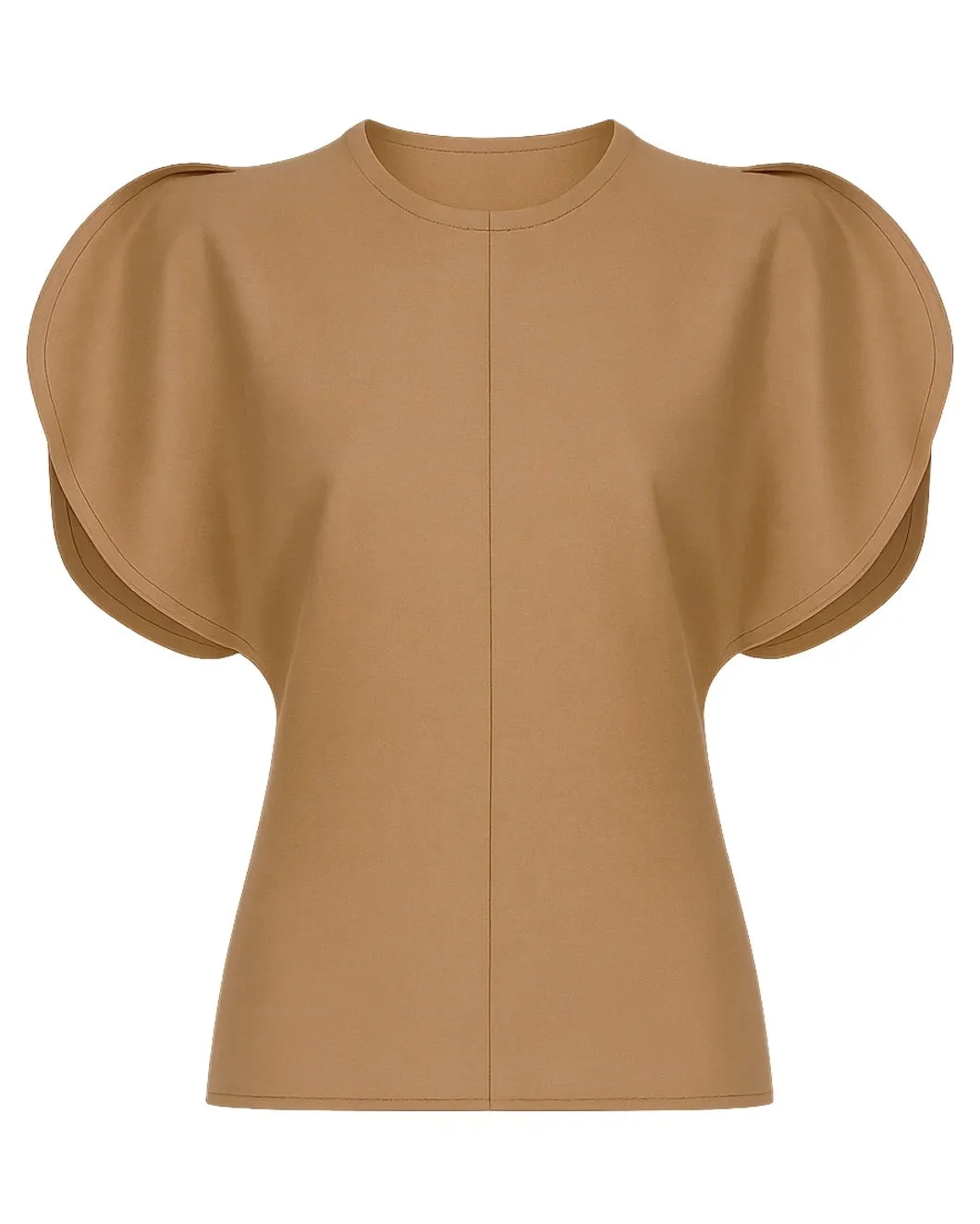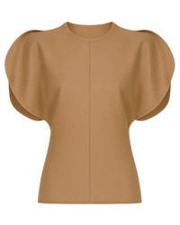The Draped Sleeve Top in Toffee Melange by Victoria Beckham is a sophisticated, round neck top featuring wide draped sleeves with contrast stitch detail, and longer length. - Back zip closure with hook & eye - Exposed baby-overlocking detail at the hem - Back waist seam - #1425WTP006579B