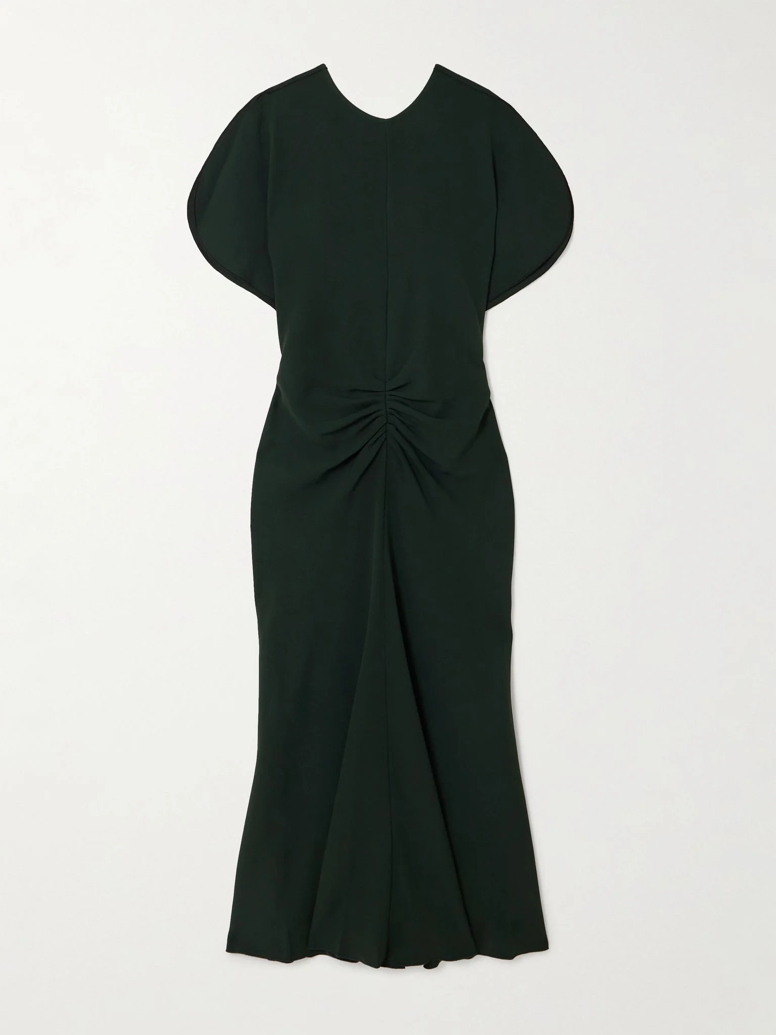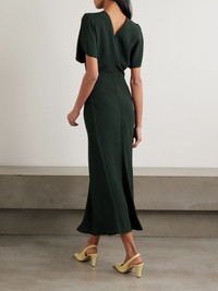 The definition of elegance, Victoria Beckham's midi dress is cut from smooth crepe that's gently gathered at the waist to accentuate your natural figure. The tulip sleeves and fluttery hem add to its feminine feel. Size & Fit - Fits true to size, take your normal size - Cut for a slim fit - Mid-weight, slightly stretchy fabric - Model is 175cm/ 5'9" and is wearing a UK 8 Model measurements: - Bust: 81cm/ 32" - Waist: 62cm/ 24.5" - Hip: 89cm/ 35" Details & Care - Dark-green crepe - Concealed hook and zip fastening at back - 50% viscose, 47% acetate, 3% elastane - Dry clean - Designer color: Dark Pine