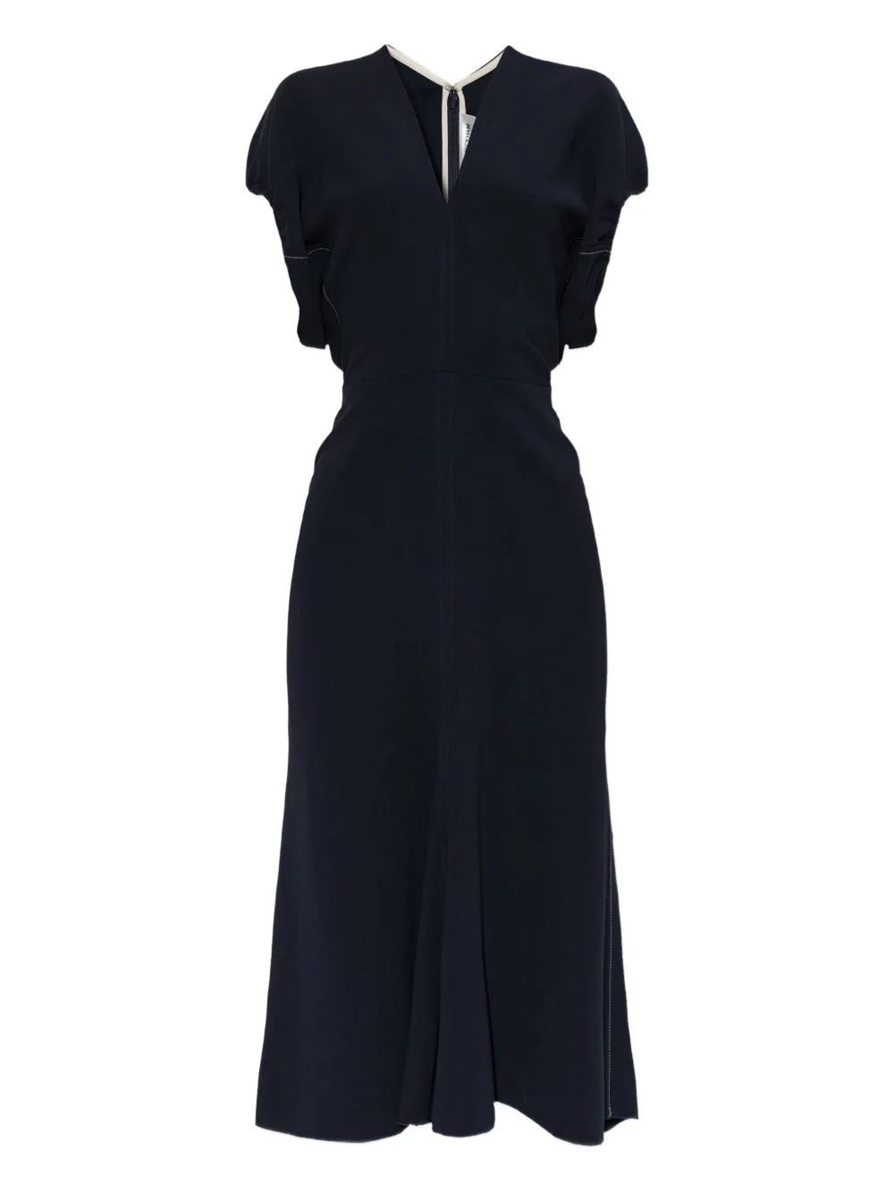 V-neck midi dress Highlights - Navy blue - V-neck - Short sleeves - Midi length - Seam detail Imported Composition Viscose 50%, Acetate 47%, Elastane 3% Washing instructions Read Manufacturer Guidelines