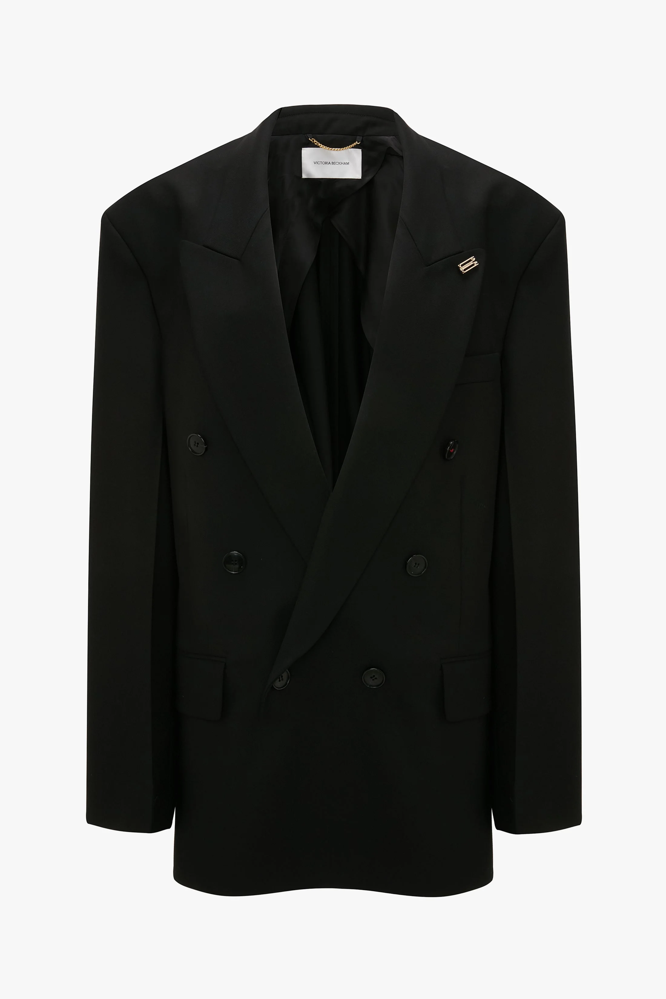 The house’s signature attention to detail brings fresh personality to masculine tailoring. An oversized fit and double-breasted fastening define the Relaxed Double Breasted Jacket in Black, which is elevated with attractive talking points, including an elasticated cinch detail at the back waistline, a chain detail at the back of the neck and a single contrasting red stitched button at the front and at either cuff. Half butterfly lining and an internal chest pocket complete the look. Size & Fit - For a more fitted look, take one size down Product Details - Oversized silhouette - Double breasted fastening - Six front button detail, one button with contrast red stitch - Back waist elastic cinch detail - Interrnal chest pocket - Front flap pocket detail - External slanted chest pocket - 53% Polyester 43% Virgin Wool 4% Elastane - Dry clean only - Made in Portugal