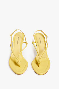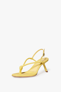 The Estelle is a new shoe design for VB Footwear, with an almond toe and heel design that features an unexpected, kicked-out inclination. Simple, tubular straps in pale yellow nappa leather, an adjustable back strap, and a knotted toe post detail lend this sandal an open, naked look that plays to the season's light, easy aesthetic. Product Details - Nappa Leather Fabrication - Almond-Toe Design Detailing - Heel Height: 70mm - Wipe Clean With a Soft Dry Cloth - Fits true to size, take your regular size - Made in Italy - 100% Lambskin Leather
