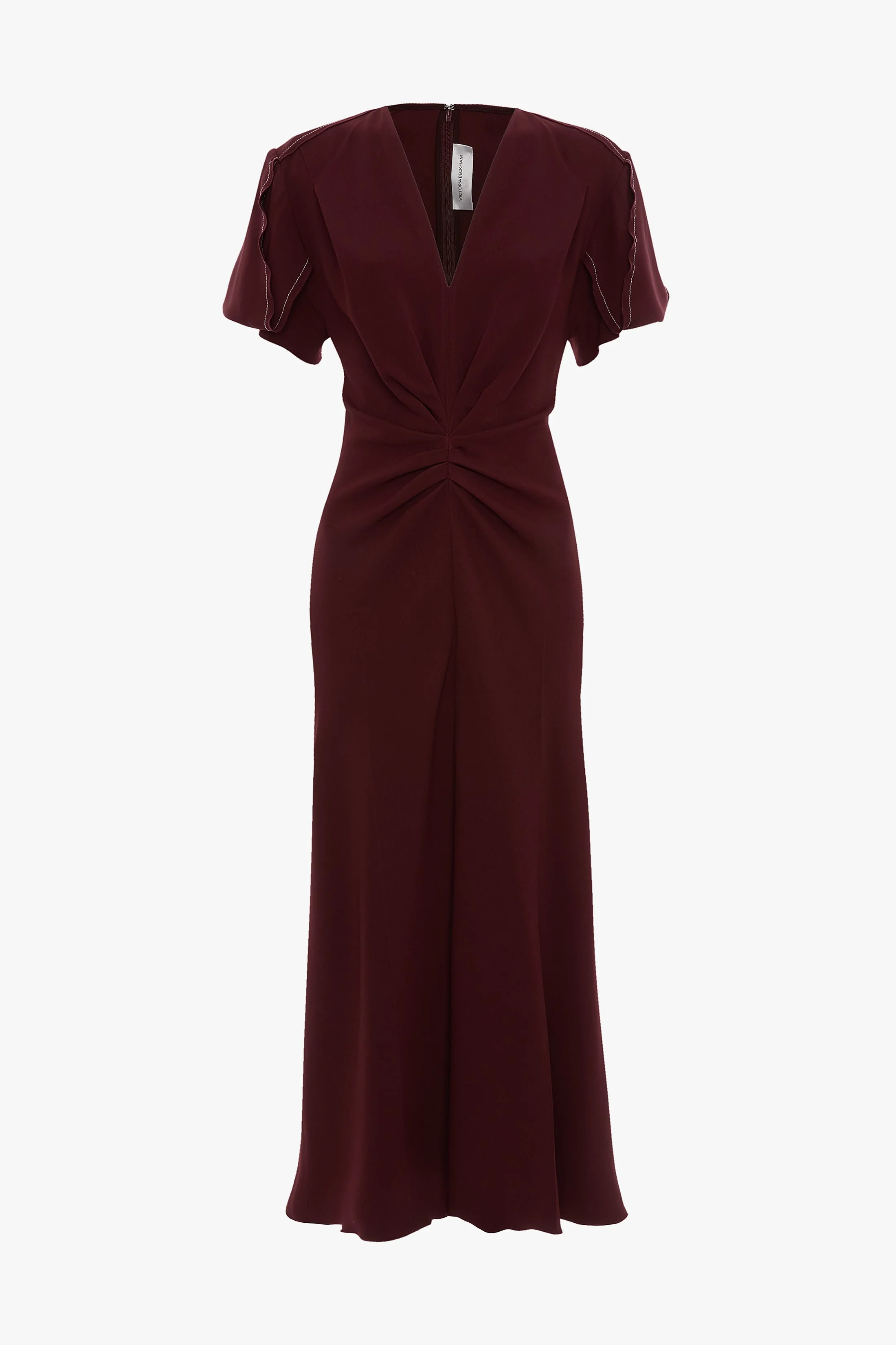 - Fluid cady v-neck midi dress - Pleat waist detail - Short drape sleeves - Concealed zip with hook & eye closure - Exposed seams and contrast topstitching - Hard press details - Subtle asymmetrical hem - 50% Viscose 47% Acetate 3% Elastane - Made in Portugal Classic design codes are revised and energised in the Eve Midi Dress in Cinnabar Red. Defined by its short sleeves with draped inserts, it has a V neckline, pleated detail at the waist and shoulder and a longer-length hemline at the back. Exposed seams and a contrasting topstitch add tactile finishing touches. SIZE & FIT - Sizing runs small, we recommend taking one size up - Fitted through the hip and more relaxed through the bodice - The model is 5'11’’/180cm and is wearing a size 6 Standard - Standard Length: 40.5”/103cm - Short Length: 38”/97cm