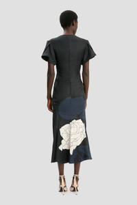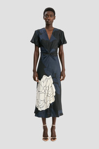 The house’s signature Eve Midi Dress is reconsidered with a refined print in Pale Rose. Crafted from Navy viscose twill and fully lined, it has short sleeves with a drape insert, pleats at the waist and shoulder and a longer-length hem at the back. Size & Fit - Fits true to size, take your normal size - Fitted through the hip and more relaxed through the bodice - The model is 5'11’’/180cm and is wearing a size 6 Product Details - Printed viscose fabrication - Pleat waist detail - Short sleeves with drape insert - Concealed zip with hook & eye closure - Hard press details - Subtle asymmetrical hem - Fully lined - 100% Viscose - Made in Portugal