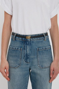 Exclusive to this season, the Micro Frame Belt in classic Black is crafted from smooth calf leather and embellished with gold hardware for an elevated finish. With its streamlined design, it will add a discrete but directional finishing touch to any outfit. Styled with the Alina Jean and Asymmetric Relaxed Fit T- Shirt Size & Fit - Buckle: Height 17.5 mm Length 33.5 mm - Fits true to size, take your regular size - Small: Length 70cm, Width 20mm - Medium: Length 80cm, Width 20mm - Large: Length 90cm, Width 20mm - X large: Length 100cm, Width 20mm Product Details - Smooth Calf Leather - Luxury gold plated hardware - 100% Calf Leather - Wipe clean with a soft, dry cloth - Made In Italy