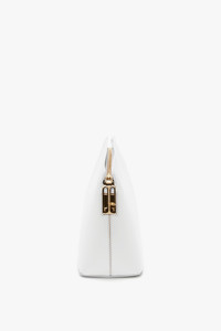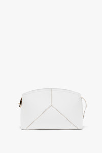 A highlight from the SS24 runway and a favourite of Victoria’s, this glossy calf leather Clutch introduces a fresh silhouette to the brand’s leather goods edit. Presented in crisp White exclusively for Victoriabeckham.com and Net-A-Poter.com customers, it has a structured design, with an elegant curved top. Embracing a new hardware language, it includes a branded padlock serving as zipper and closure and a snap button at one side to hold the zip tail in place. Leather panels stitched to form a V shape add visual interest. Styled with the Gathered Sleeve Midi Dress and VB Monogram Tights Size & Fit - Height: 18.7cm, Width: 28cm, Depth: 9cm Product Details - Textured shiny calf leather - Structured with a curved shape opening - Flat pocket in the main inner compartment - Snap button on the side to hold the zip tale in place - Engraved VB branded padlock mechanism at closure - 100% Calf Leather - On calf leathers, regularly apply a very small amount of nourishing cream and buff gently using a cloth. Colourless cream should help avoid staining. - Made in Italy
